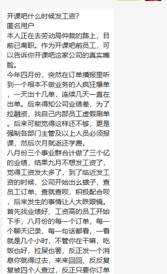 首先找业绩好、工资高的员工开始下手,八月份的每一个订单,每一个聊天记录,每一句话都看,一看就是几个小时,不管你在干嘛,吃饭也好,拉屎也罢,反正发一个消息你就得过去,来来回回、反反复复被四个人查过,反正只要你订单多,提成高,公司就默认你有问题,查不出来硬查,他们专门组织一个小组,把你单独叫到办公室,一群人审你,像审犯人一样,威逼利诱,威胁恐吓,无所不用其极。后来干脆直接没收我们所有的电脑和手机,把我们的聊天记录,浏览记录全部看一个遍,甚至连私人微信都看。期间学科运营还问我们为什么不回复学员信息,工作手机和电脑都被没收了,拿什么回复学员呢?每次都要被单独叫到办公室接受他们几个小时的盘问,一边面对着高强度高压力的工作,一边还要面对他们无休无止地盘问,而且被审问之前还要签署保密协议。之后这帮审问我们的人就开始恶意诬陷和诽谤,说我们违规,自己报课是违规行为,登陆学员学习中心帮忙查看学习打卡记录也是违规行为,一个学员报名多个课程也是违规行为。试问开课吧这些临时规定的所谓“违规”,之前有任何说明吗?开课吧之前强迫员工报课的时候怎么不说这个是违规行为呢?自己后端服务差,学员找到前端销售帮忙解决问题,你们居然厚颜无耻的说道:“课程卖出后,学员就与我们销售无关,销售插手就是违规”这种话,真的可以算得上是在线教育行业里的奇葩了。更可笑的是,之前公司为了鼓励单个学员报名多个课程,推出了联报打折的活动,然后审查的时候,居然质问我们为什么让学员报名这么多课程。课程是你们制作的,价格和活动也是你们制定的,按照你们的要求卖出去了,完事之后就要接受你们的怀疑和质问,人家学员报课是没给你付钱吗?