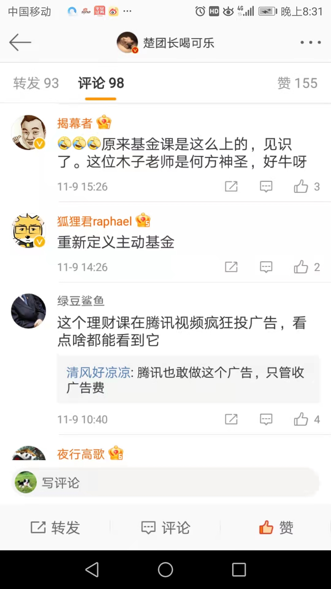 对于危机公关的处理微淼擅长的手法就是狡辩,也就是嘴硬罢了!如果有需要我们还能让被骗的学员通过以前的微信群搜索出来很多这个对于“主动基金”的定义,表达都是一模一样的。也赖得搭理了!不过谎言被拆穿了为啥还有勇气如此这般呢?想不通!嚣张至极!估计今天微淼都要联系微博上最早曝光出来的博主进行投诉或是联系中国基金报的记者进行XX。好了。就到这,具体你们看下面的截图!