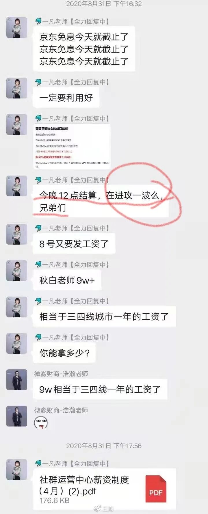 【特别关注】京东财商老师曝一同事拖欠工资绩效还被恶意辞退 该员工在全国财商员工群刚发信息就被踢出群后各种刷报名物料怕被别人看到