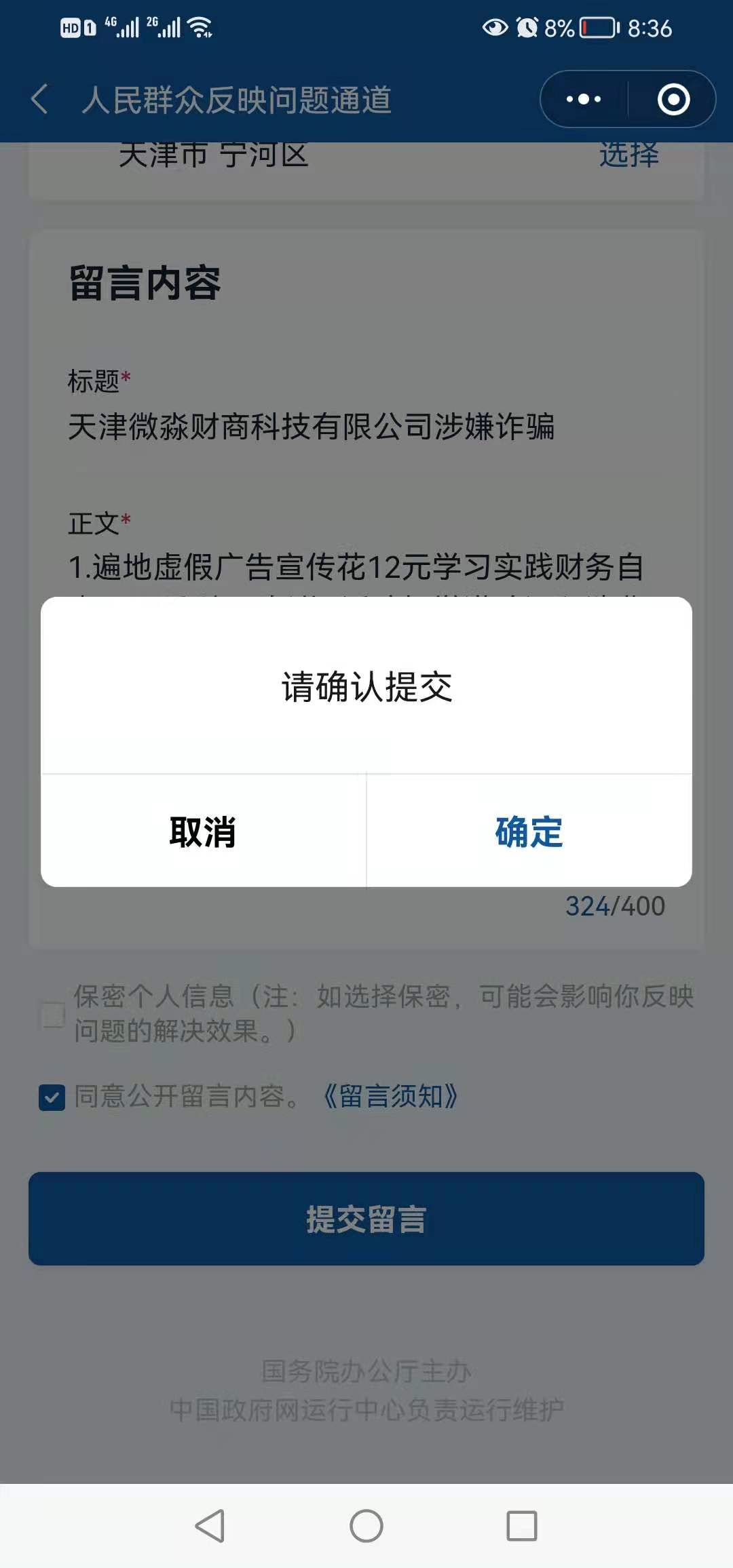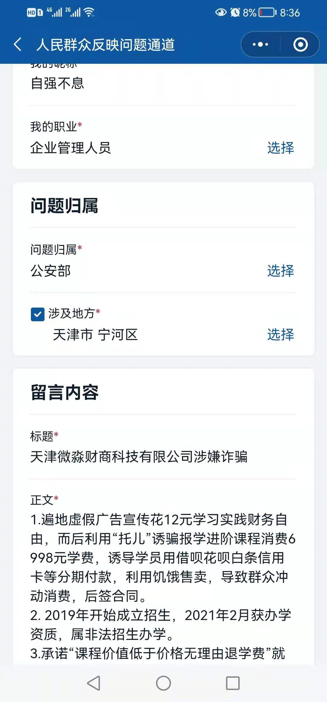 同时向天津工商投诉的微淼学员获得一个信息就是微淼被工商部门罚款了49万,我们通过网络大V的网络曝光,此前最高峰时微淼一日流媒体投放的广告是2000万,这49万的罚款对微淼简直是九牛一毛,就是每天罚款49万也无妨。但是罚款了49万,上百万百姓被骗的6998+12元还有被微淼软性荐股亏损的钱学员向谁要求赔付呢?