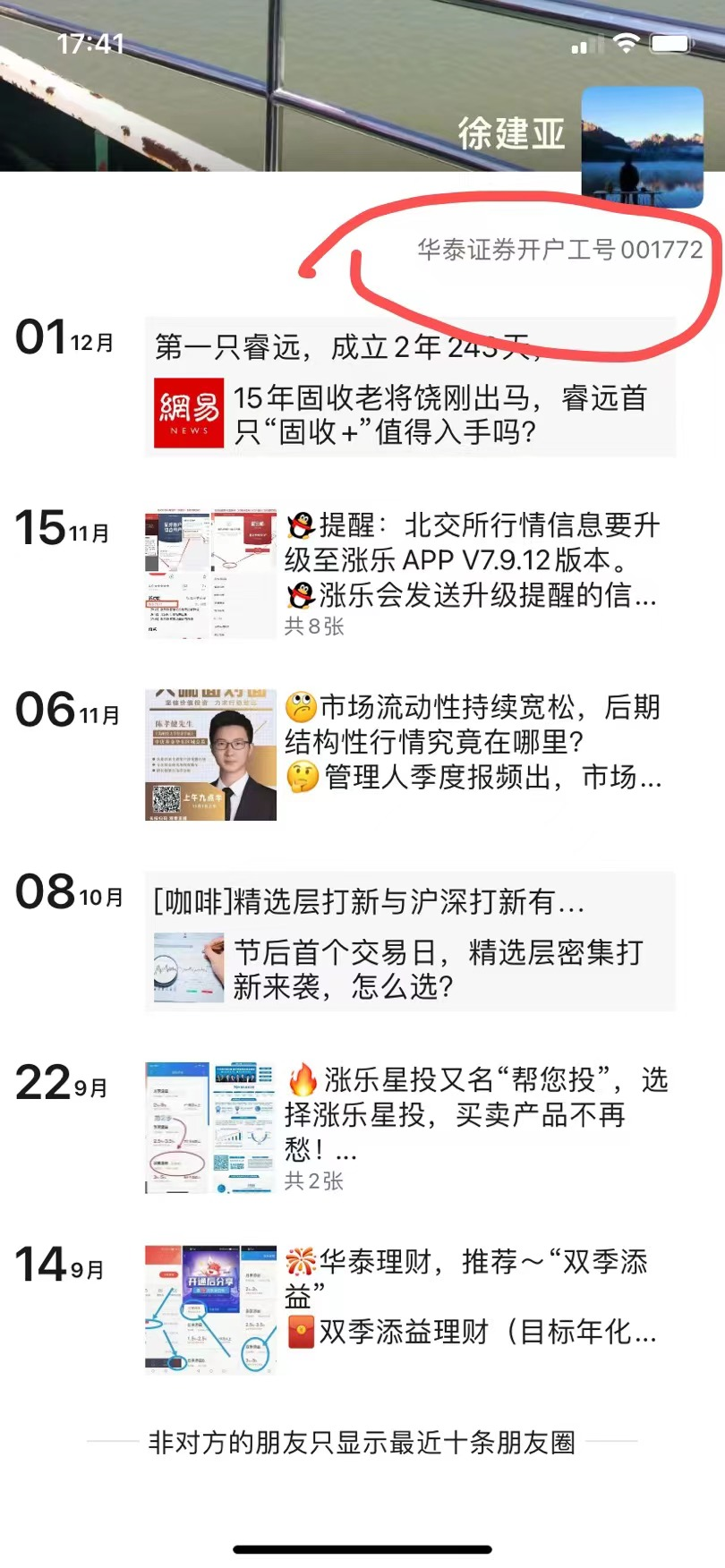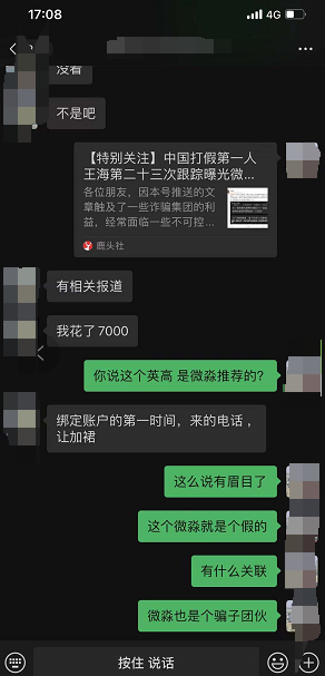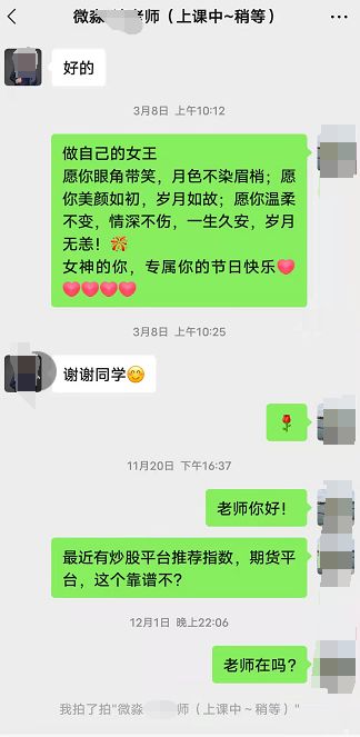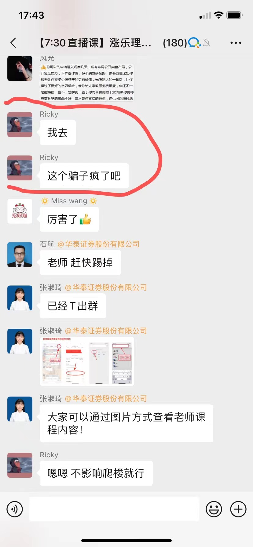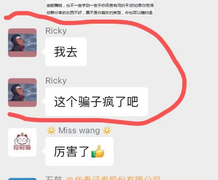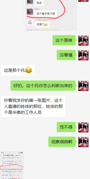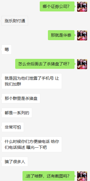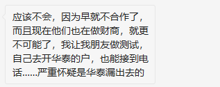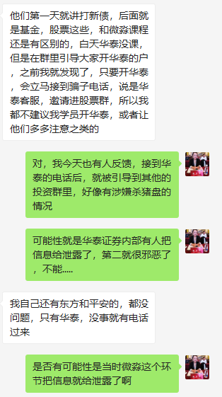 另一位网友加我们反馈信息,其中也就是微淼老师推荐华泰开户后接到了其他电话加入到投资群里的种种可疑的情况(目前判断是华泰证券泄露了用户的信息,并且这个反馈已经不是第一次了,此前我们怀疑是微淼的所为,现在来看华泰的也可能存在问题):