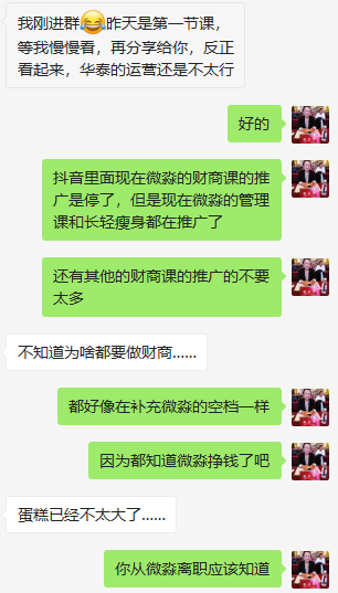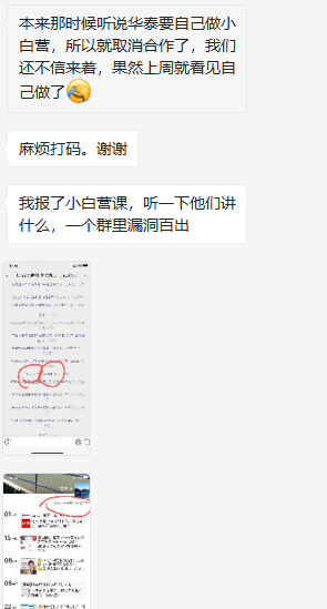 前阵子不知道是政策的高压,还是微淼的负面舆情太多,华泰证券暂停了和微淼的合作,微淼老师当时就收到信息,华泰证券要自己做“财商课”小白营了,果然华泰证券上周已经开始运作了,微淼离职老师已经关注到,并报名进入开始观察中!发现目前还是很容易看出破绽,不是太专业!建议华泰证券可以直接聘请微淼的高手加入正规发展业务!其中有一个情况,就是疑似华泰证券泄露了开户人员的信息,已经导致了部分人员被杀猪盘诈骗!此前就有微淼的学员反馈过相关信息,今日微淼老师在交流中也提到了这个情况,同时一位网友碰巧也反馈到了相关信息!
