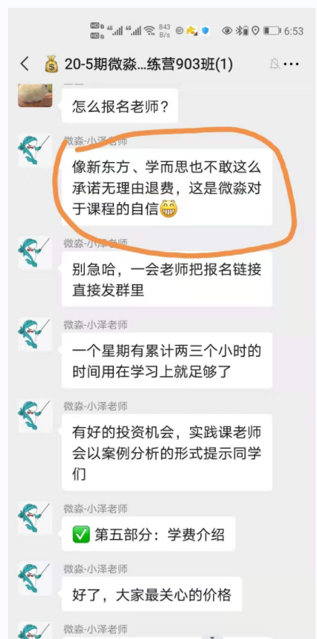多少人被以下的微淼话术骗的教了费,当时后面又不承认,而因为解散群,很多老百姓都不会去保留这个信息!所以最后死无对证,让学员无法退费!