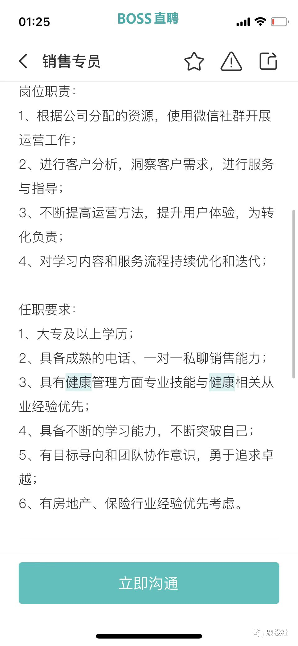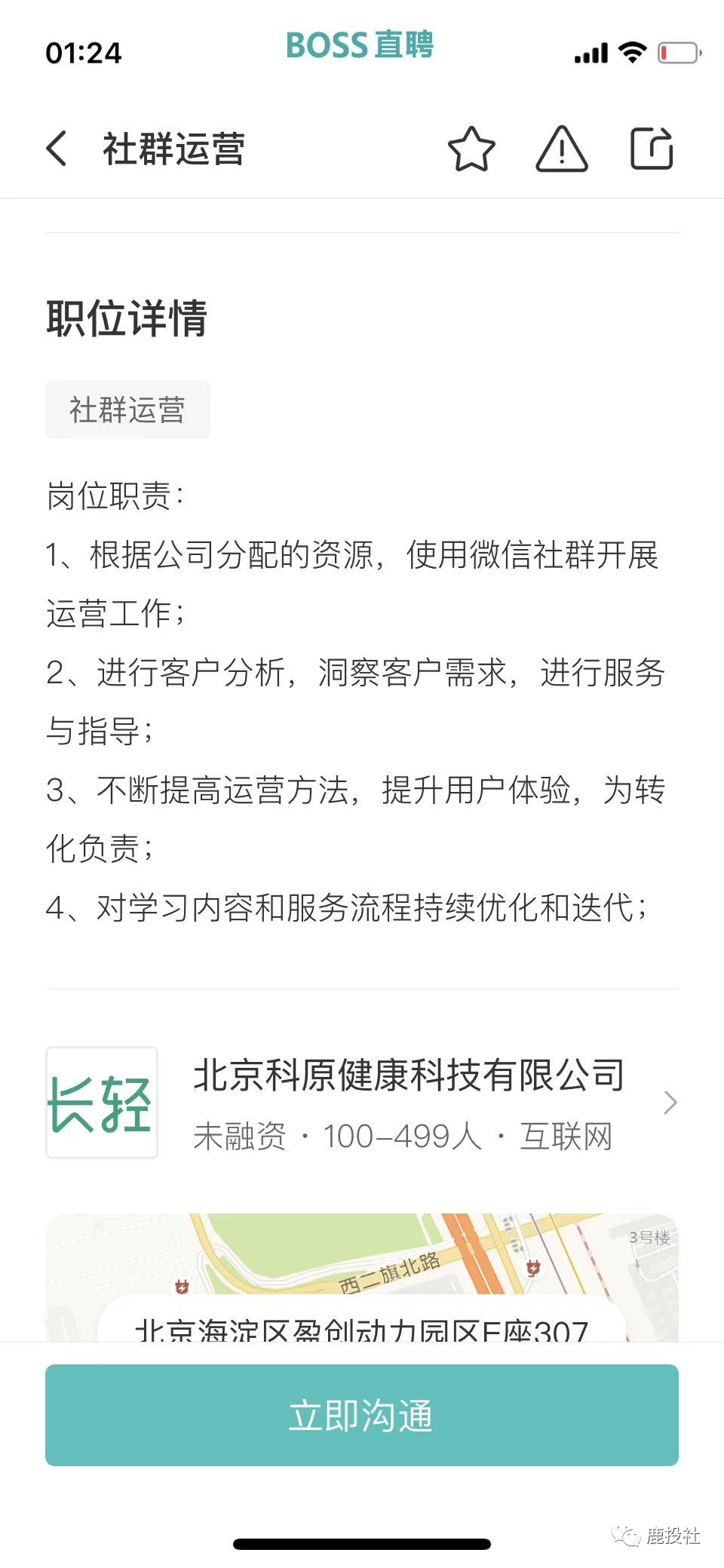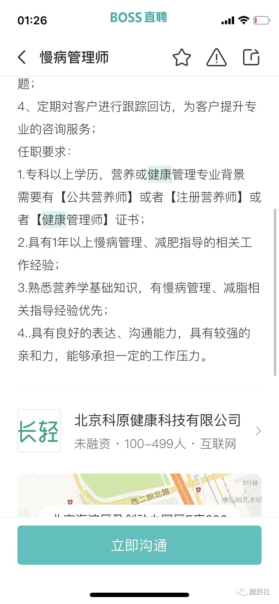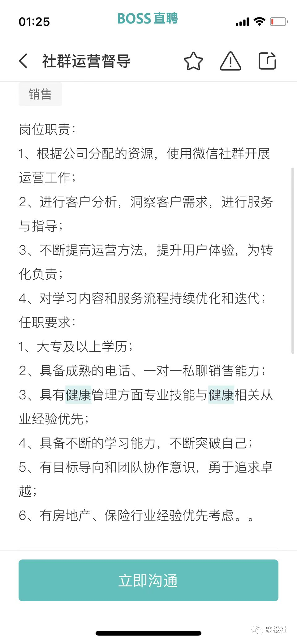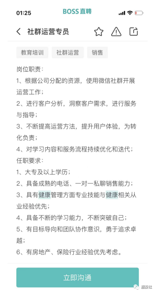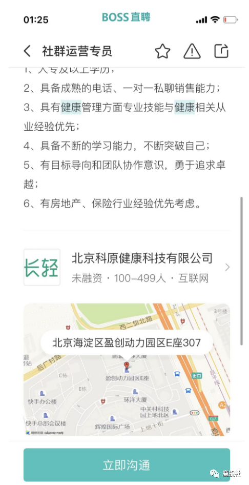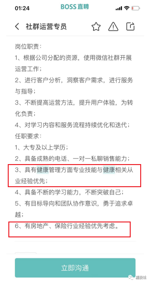 我们通过BOSS直聘的APP看到微淼体系下的长轻健康(原长轻瘦身)(公司名字用北京科原,以前用天津健康美丽公司,换来换去,我们都很迷糊,估计和天津那边闹翻了,天津也不给他们税收优惠了,又用北京的这个壳)项目除了象征性的招聘几个营养师以外,大量招聘销售岗(其中包括社群运营、社群运营专员、社群运营督导、销售专员)都提到一点有房地产和保险行业经验优先!