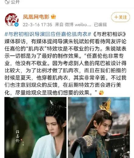 前两天《与君初相识》的导演朱锐斌倒是出来回应了,“因为考虑到人鱼的尾巴被设计得比较大,为了比例才做了肌肉衣,而且在我们拍摄的时候是夏天,他穿着肌肉衣,其实非常辛苦。注意到了观众的反馈,在后期特效方面会进行美化,尽量呈现出大众想要的效果。”