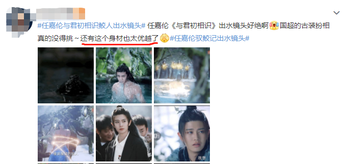 词条叫#任嘉伦与君初相识鲛人出水镜头#,也不知道是自来水还是买的,一水儿营销号夸任嘉伦的腹肌有多杀。