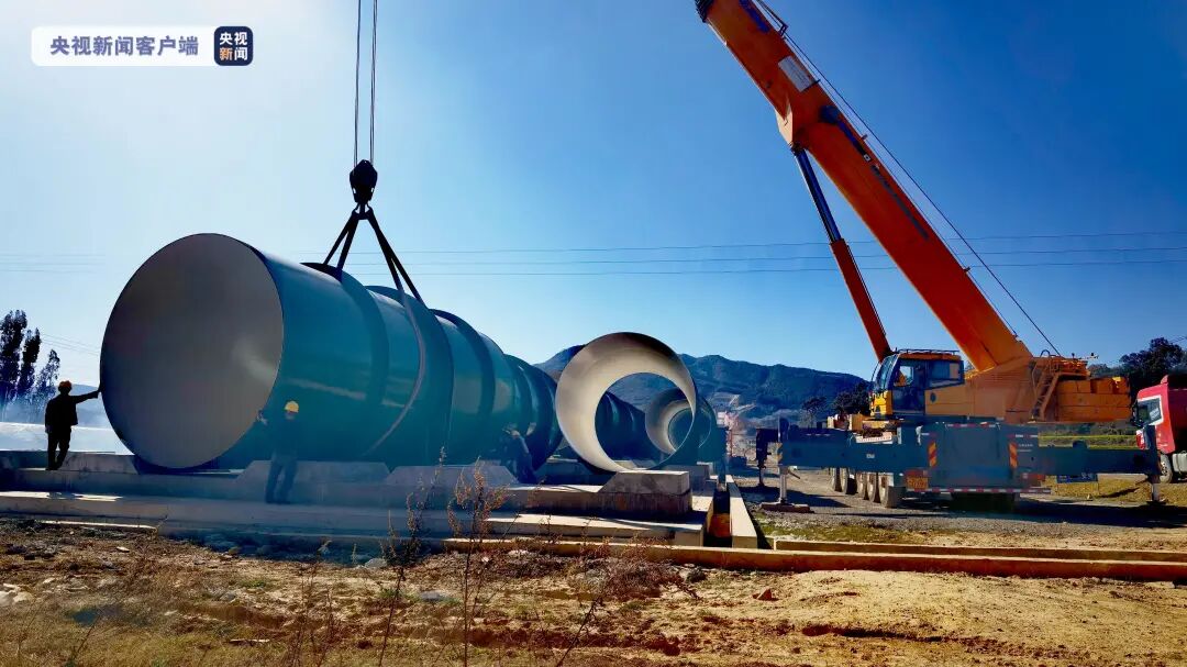 云南滇中引水工程输水总干渠总长664.24公里,其中有58座隧洞,长度611.99公里,剩余部分则采用倒虹吸建设方式。倒虹吸是在渠道与道路、河流发生交叉或在渠道穿越山谷时经常采用的一种立交水工建筑物,做好基础后,要用水管连接两端的隧洞。在观音山倒虹吸建设现场,施工人员正在用大型吊车吊装压力钢管,为了提高效率,这些大型压力钢管,都是在施工现场完成加工。