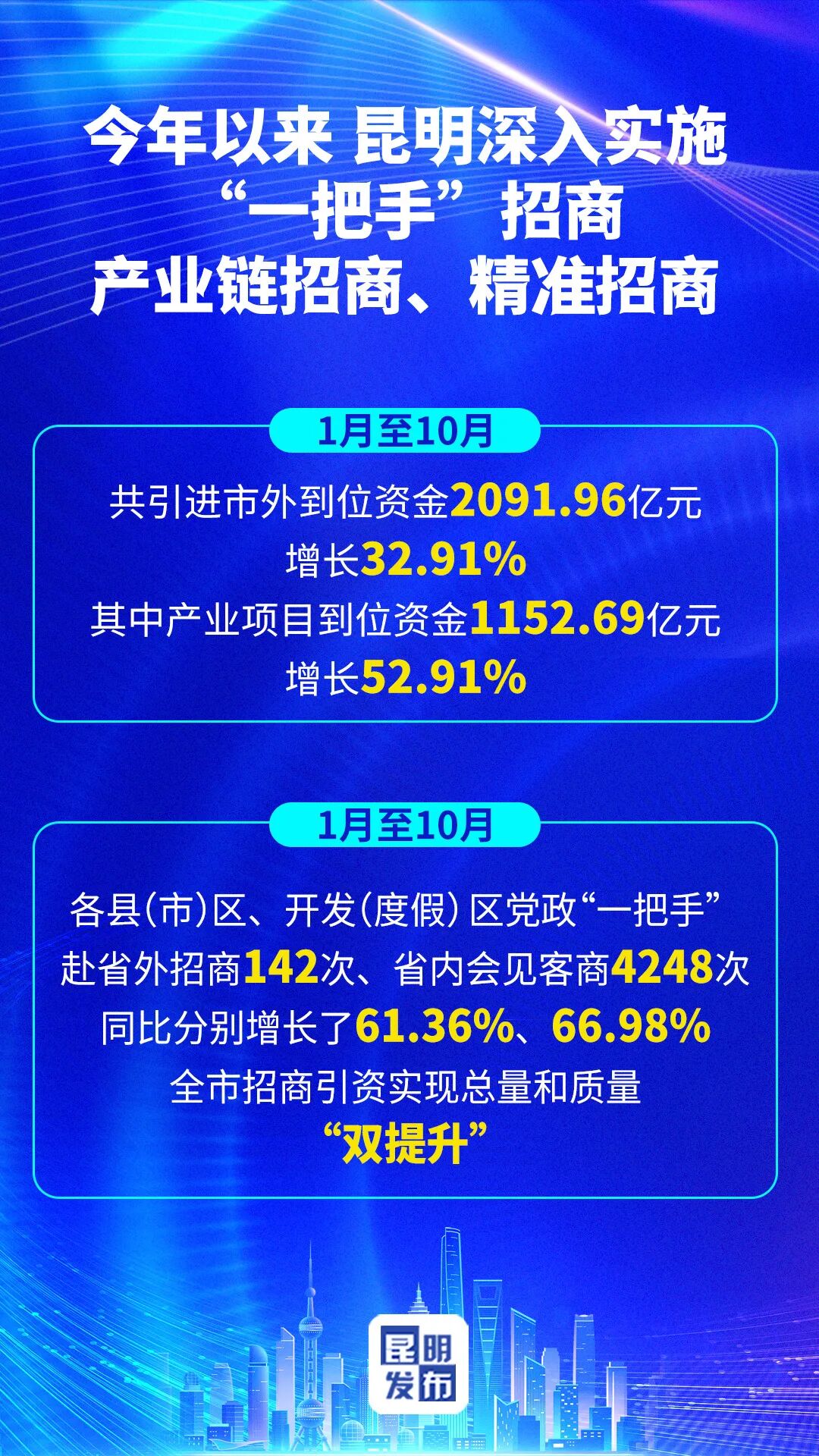 今年以来,昆明坚持“招商是第一要事”,在市委、市政府的高位统筹推动下,深入实施“一把手”招商、产业链招商、精准招商。今年1月至10月,共引进市外到位资金2091.96亿元、增长32.91%,其中产业项目到位资金1152.69亿元、增长52.91%。在市委、市政府“一把手”示范带动下,1月至10月,各县(市)区、开发(度假)区党政“一把手”赴省外招商142次、省内会见客商4248次,同比分别增长61.36%、66.98%,全市招商引资实现总量和质量“双提升”。