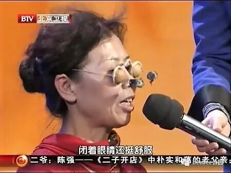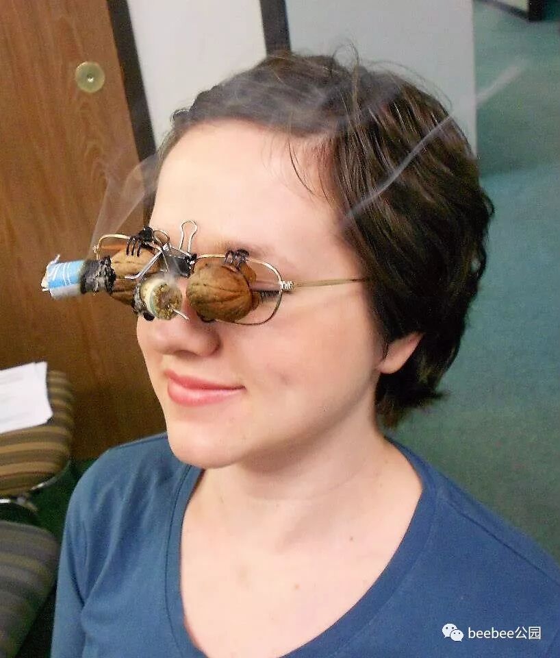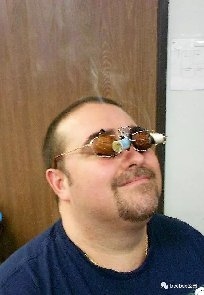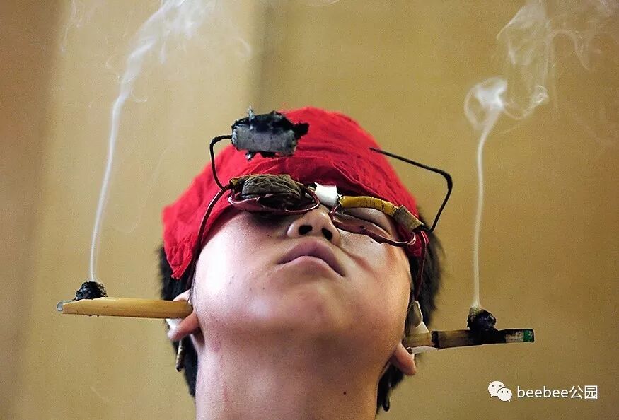 类似于眼镜的装置上插着两块燃烧的艾条,镜框中卡着半个核桃壳用于保护眼睛。