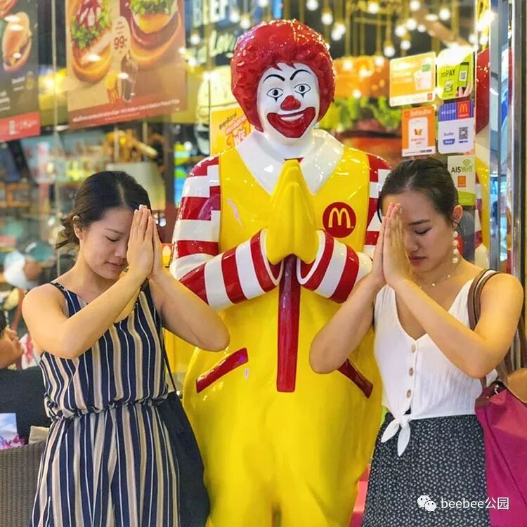 不知是出于何种目的,塑像们都保持着双手合十的宗教动作,有人猜测麦当劳集团内部有潜伏的同志。