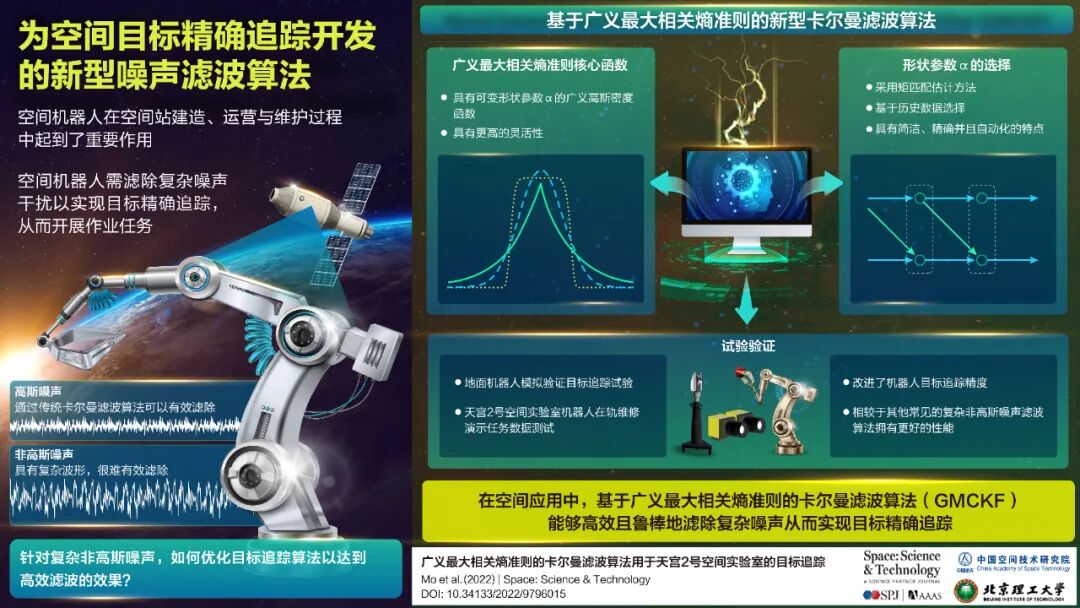 空间站是人类探索太空的桥头堡。在空间站建设及运营期间,空间机器人承担着执行建造、维护等精细操作的使命,而精细操作的前提是对目标的精确跟踪。但是,太空中的特殊环境使得目标跟踪数据中掺杂着复杂非高斯噪声,会影响目标跟踪精度。在应对复杂非高斯误差信号时,传统卡尔曼滤波器的性能会严重下滑,难以满足现阶段目标跟踪任务的高精度需求。因此,面向复杂非高斯噪声研究新型滤波算法已势在必行。在Space: Science & Technology (《空间科学与技术》(英文))新发表的文章中,湖南大学王耀南院士团队携手北京理工大学机电学院研究团队,共同提出了广义最大相关熵卡尔曼滤波器(Generalized Maximum Correntropy Kalman Filter, GMCKF),旨在有效应对目标跟踪过程中可能遇到的各种形式非高斯噪声,并提高其跟踪精度。
