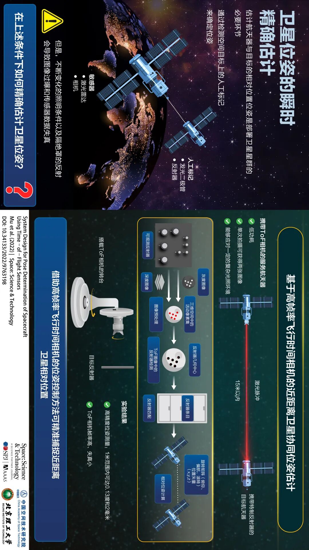 航天器位姿确定旨在获取航天器与目标的相对位姿。相对位姿运动参数有六个,用来表征平移和旋转运动,这也是相对导航滤波方案中的基本要素。航天器位姿确定是许多空间任务的必要环节。传感器是位姿确定的重要工具,而飞行时间(Time-of-Flight, ToF)传感器因其具有自抗扰、自主照明和低功耗等优点,已被广泛用于合作目标的位姿估计。在Space: Science & Technology (《空间科学与技术》(英文))《微小卫星动力学与控制研究最新进展》特刊新发表的文章中,南京航空航天大学研究团队联合上海市空间智能控制技术重点实验室,共同提出了使用ToF相机的合作航天器位姿确定系统,即通过搭载ToF相机的纳卫星来实现对具有反射标记合作航天器的相对导航。