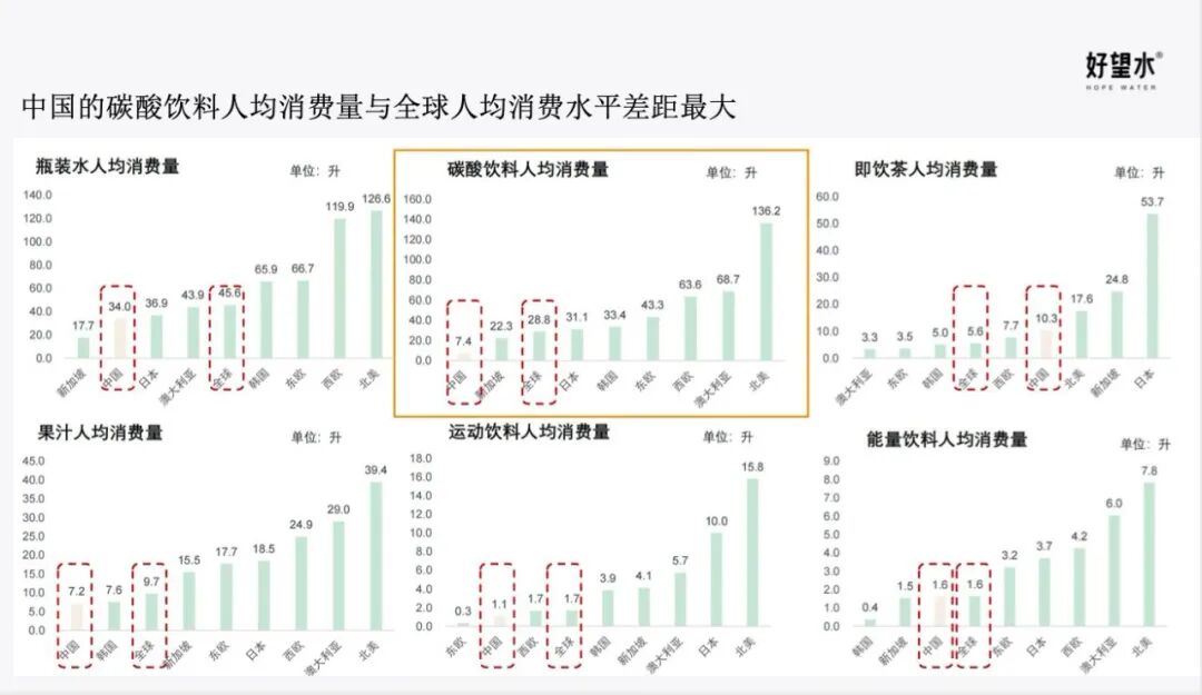 这张图是中国碳酸饮料和整个海外碳酸饮料消费量的对比图,我们会发现中国整体的碳酸饮料占比还是非常小的,跟亚洲其他几个城市相比也非常少。