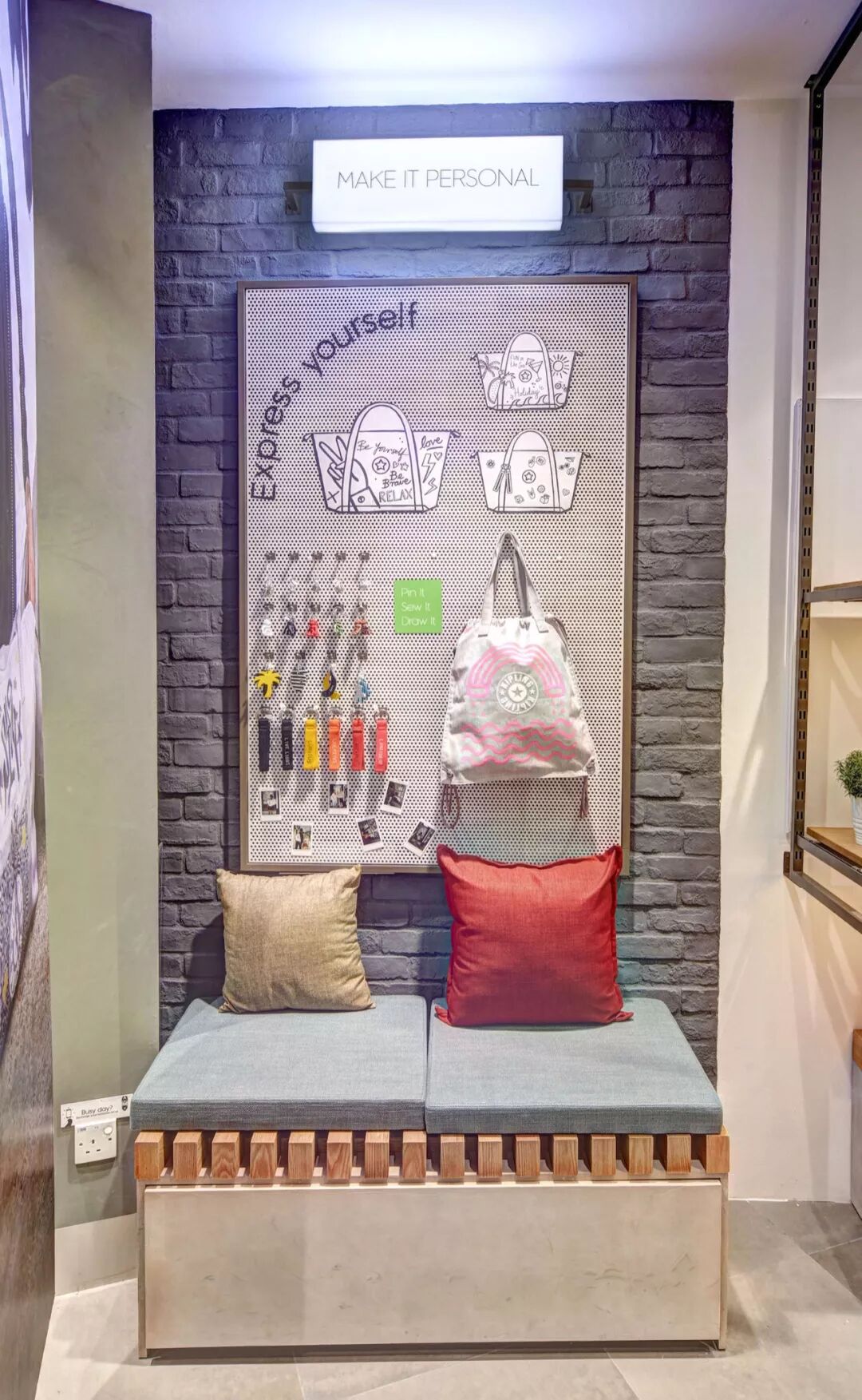 个性化区域内, 顾客可以 DIY 定制独家挂饰,创造独一无二的 Kipling 包袋;产品区域则会展示 Kipling 标志性产品——「Art M」手提袋和「Seoul」双肩包;在旅游区域,Kipling 会设置城市地图, 鼓励顾客向大家推荐城中鲜为人知的好去处。