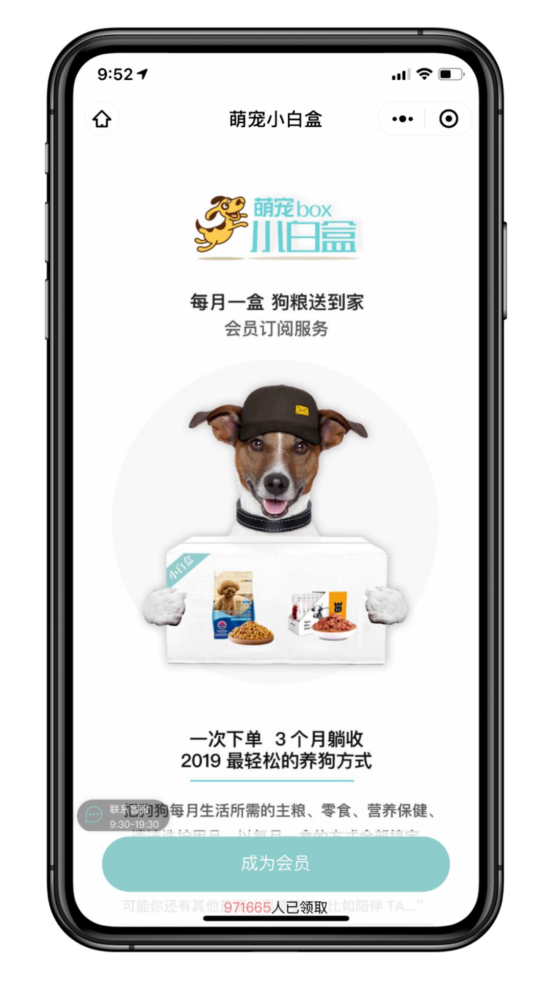 以微信小程序为主要入口,萌宠小白盒采用订阅制模式,目前主要服务养狗人群,每月向用户配送一个盒子,提供当月所需的主粮、零食、营养保健品、清洁洗护用品等用品,每盒价格在 59.9 元,类似品牌星球之前报道过的魔力猫盒。