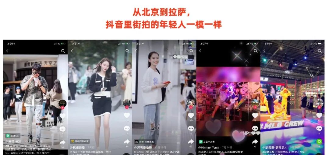 抖音大数据显示,全国范围内出现了不分城市的打卡行为——有什么事物在某线城市爆火,其他城市的年轻人也会乐此不疲地去打卡。在抖音中截取 5 个不同地区的年轻人发布的内容,从北京到拉萨,年轻人的街拍似乎一模一样。甚至曾有用户认为:中国现在最洋气的年轻人集中在乌鲁木齐、成都、西安、杭州。北京在一定程度上甚至已经变成了时尚的洼地。
