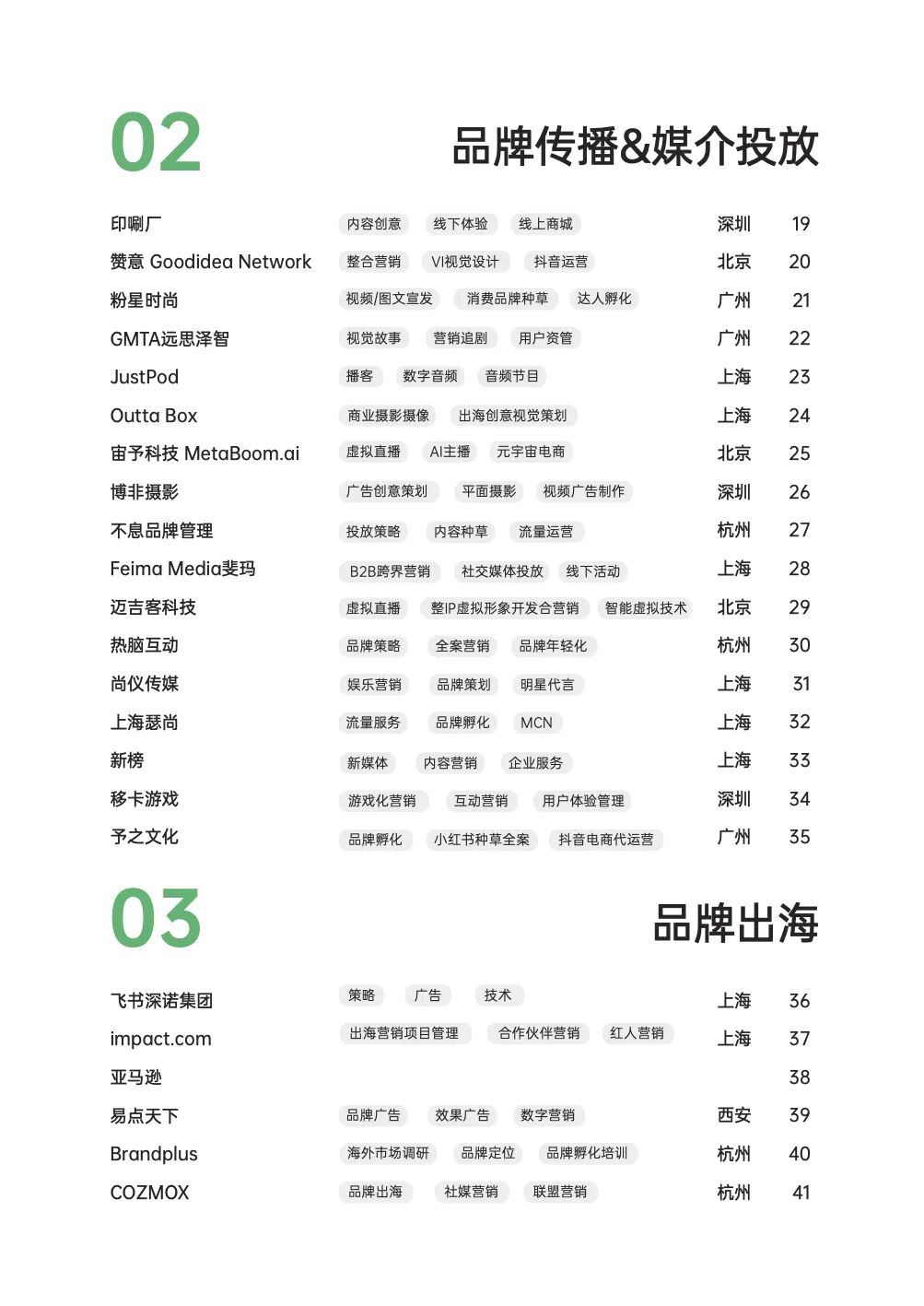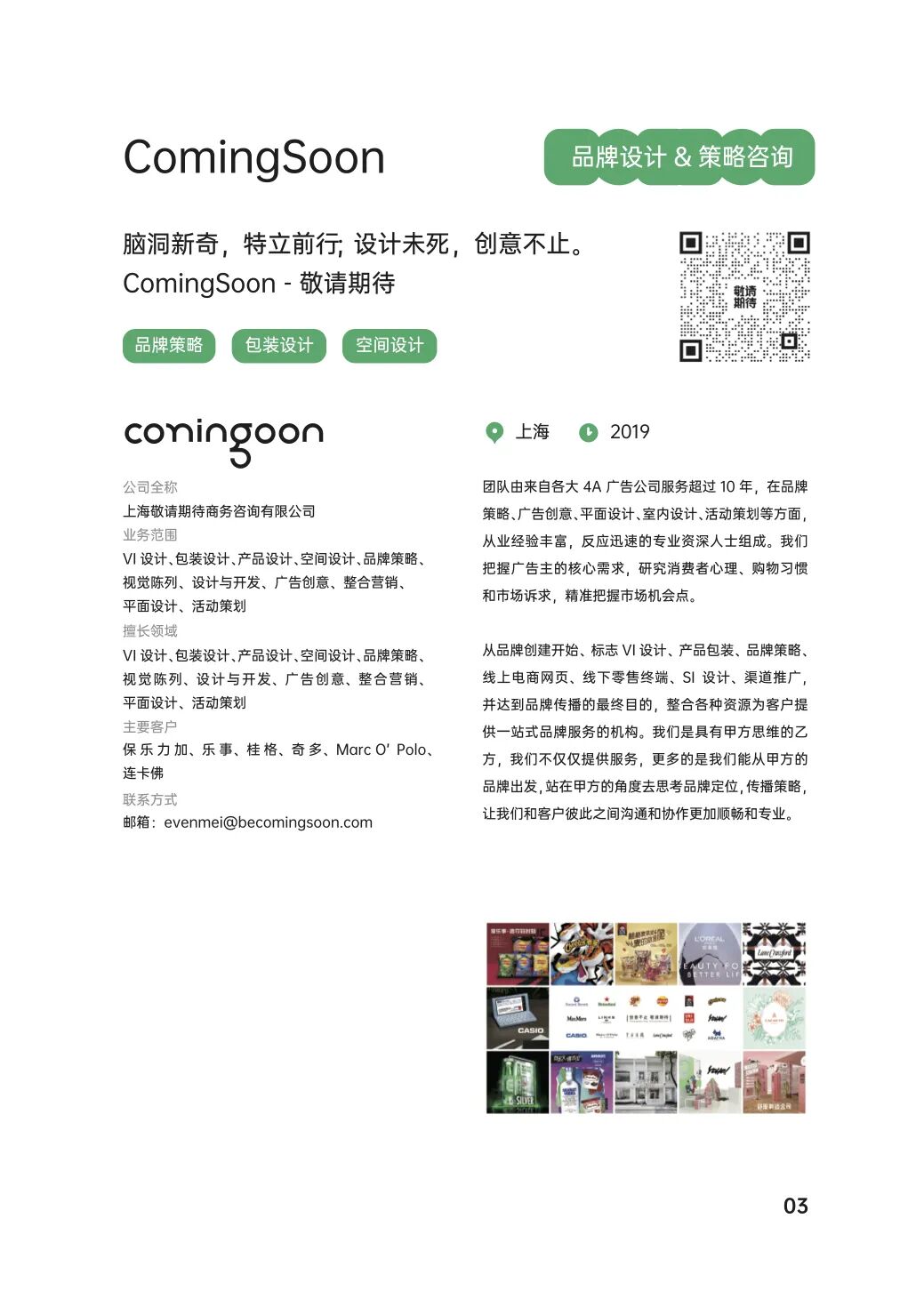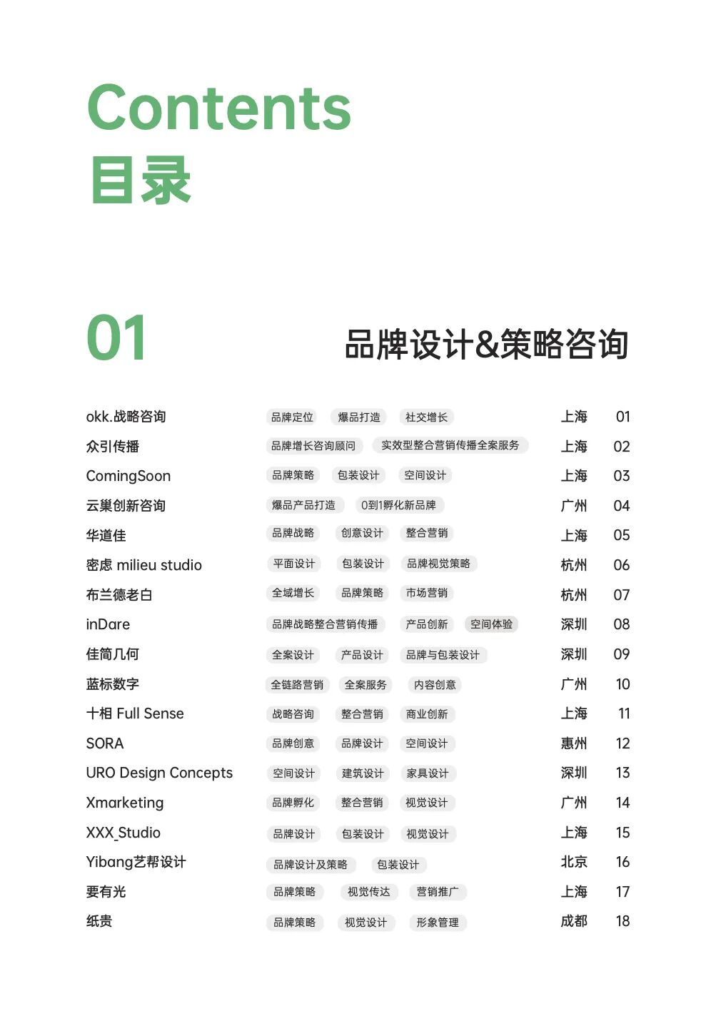 okk.战略咨询、众引传播、ComingSoon、云巢创新咨询、华道佳、密虑milieu studio、布兰德老白、inDare、佳简几何、蓝标数字、十相 Full Sense、SORA、URO Design Concepts、Xmarketing、XXX_Studio、Yibang艺帮设计、要有光、纸贵。