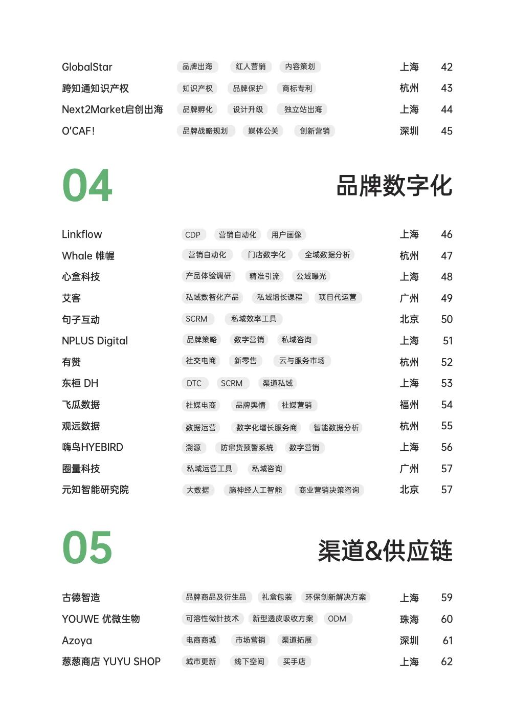 这是一本帮助新消费品牌找合作、找资源的参考手册,总共收录了 5 大类型,共计有 62 家服务商。