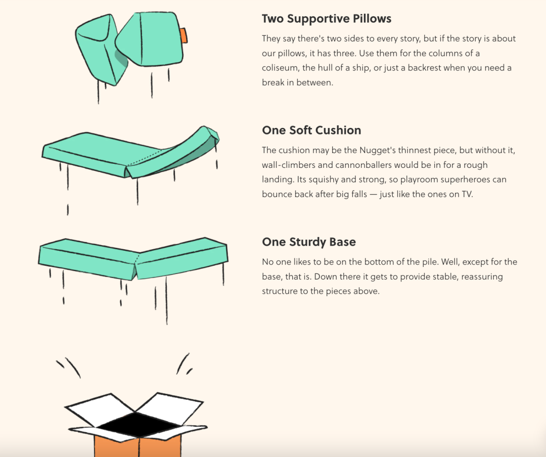 Nugget 产品的设计灵感源于创始人 David Baron 对传统沙发的不满:难组装、不舒服、笨重、不易回收。