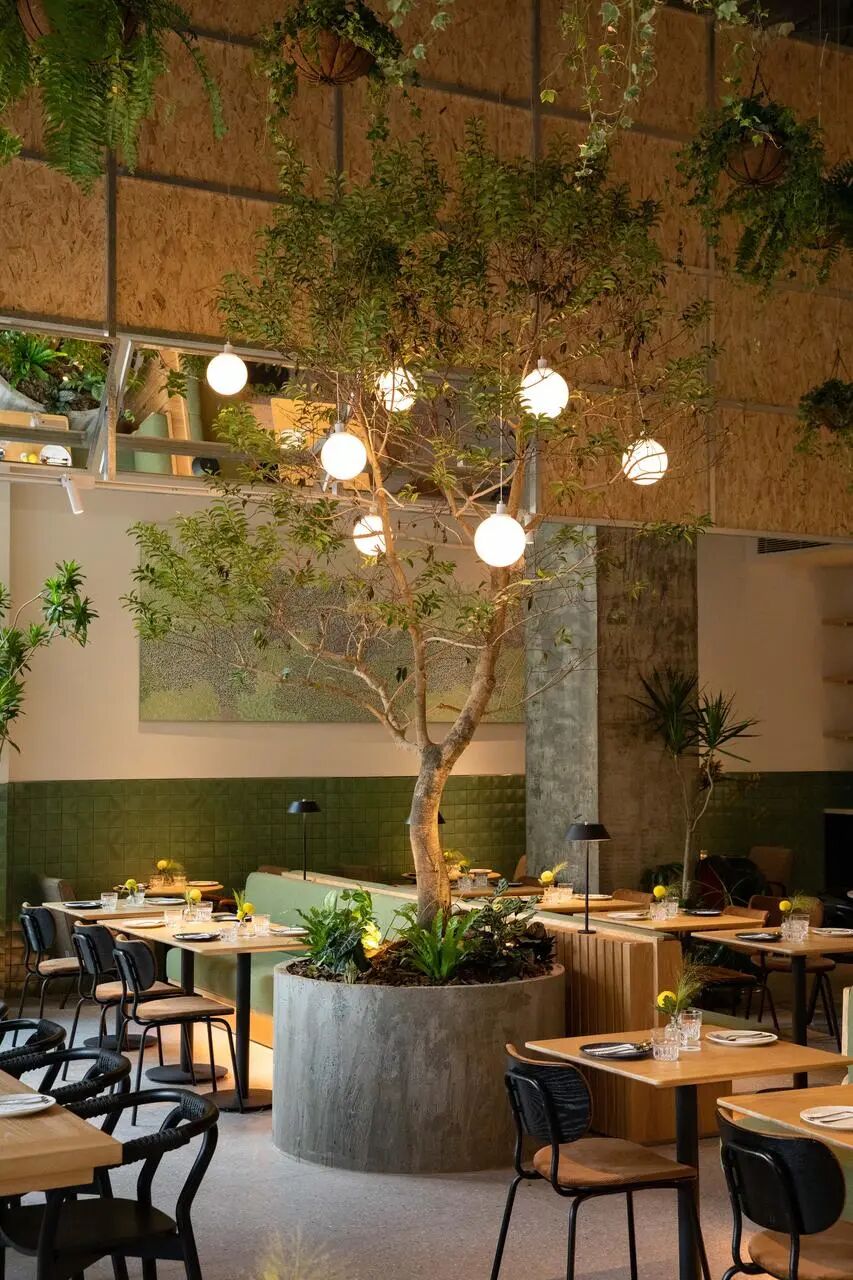 第二,就是大量运用真绿植。或许是因为来自深圳这样一个草木旺盛的城市,让代表自然的绿意成为了 gaga 品牌身份的一部分。绿植的使用对餐饮本身就是一种风险,需要花很多的精力去进行管理。尤其是在广深以北的城市,和气候原因有关,餐饮空间很少会坚持用真绿植。但 gaga 不论是进入江浙,还是北上到北京,尽管代价比在深圳时高很多倍,都仍然会用真绿植来塑造空间。● gaga 店中的绿植运用