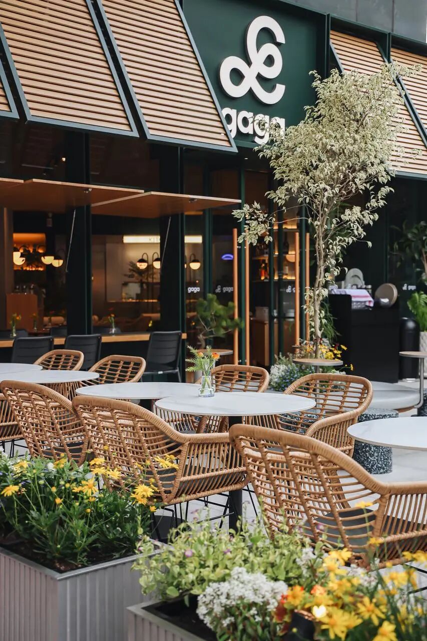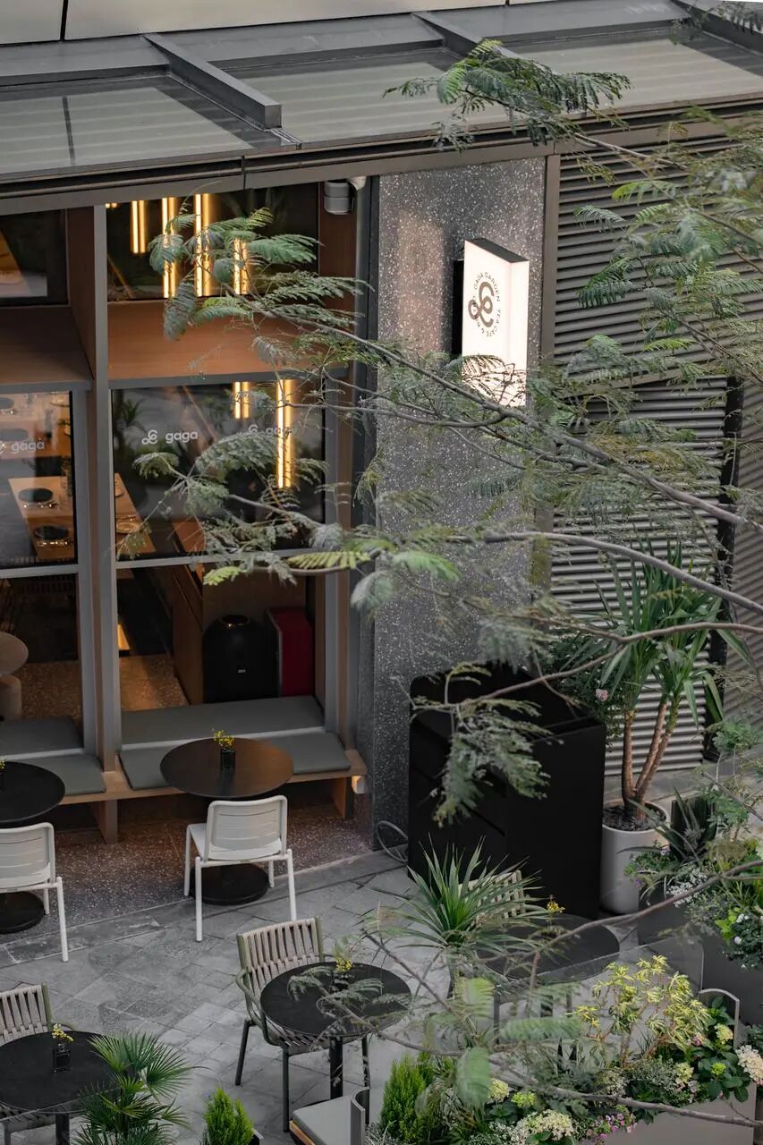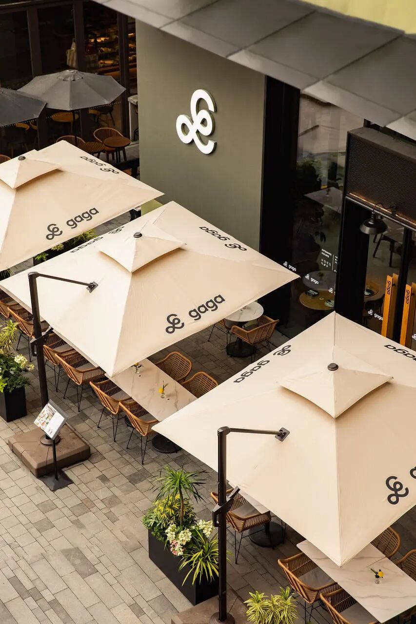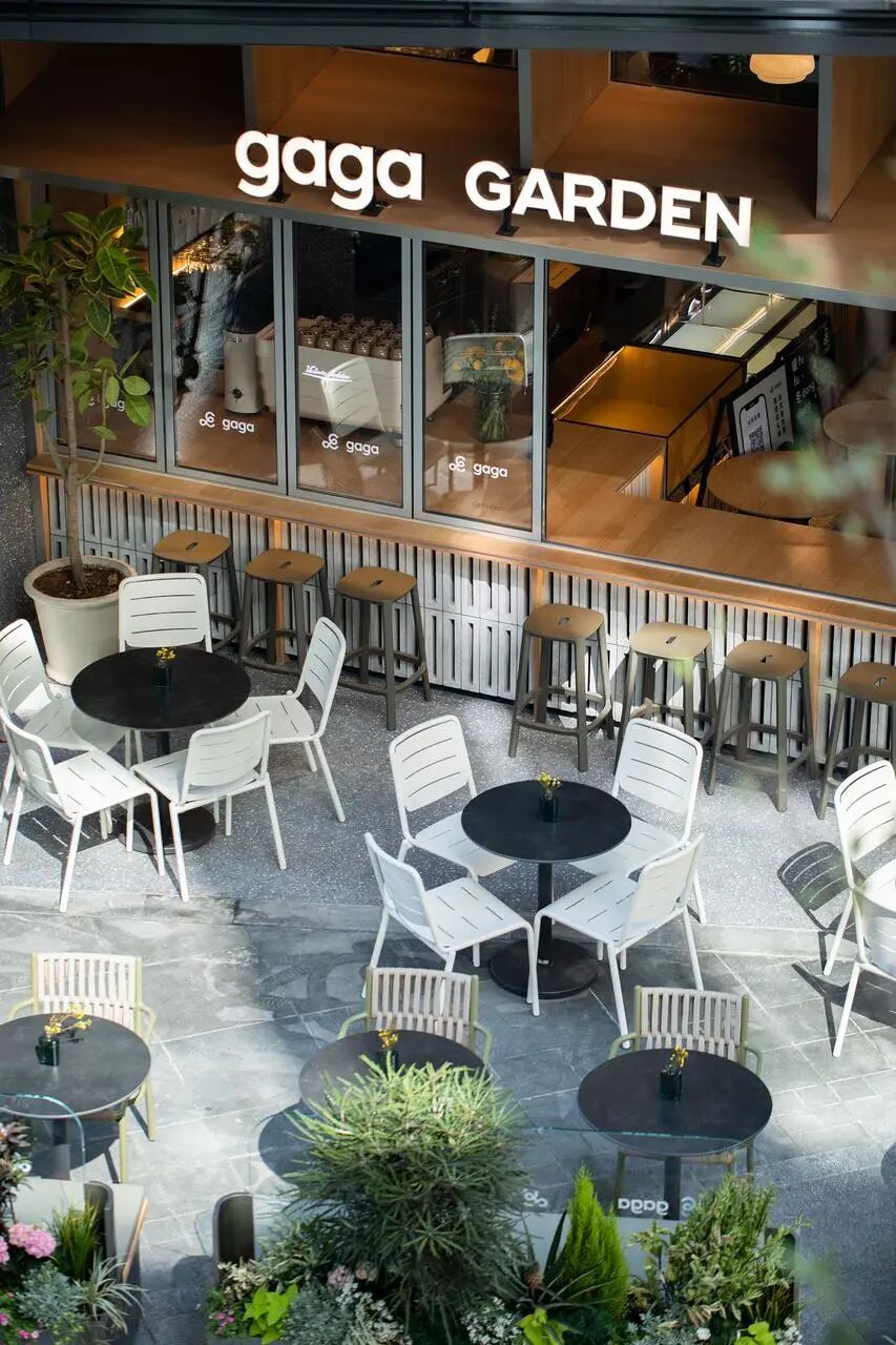 gaga CHEF 不仅是 gaga 向更精品餐厅的一次尝试,其实还有一个重要的目的——作为 gaga 在餐品上的「研发基地」。至疫情前,gaga CHEF 共推出了 5 季漂流菜单,邀请了来自澳大利亚、台北、纽约、意大利等国家的新锐主厨操刀,他们的背景都复杂且多元,在餐品上并不追求「正统」,反而是寻找一种「fusion融合」的灵感,以及主厨个人创作性格的加成。gaga 在餐品上的灵感思路是「博采众长」,从澳洲、纽约、伦敦汲取灵感,再落回到中国本地,尝试用中国食材和风味去进行重新组合。gaga CHEF 想要探索的也仍然是「休闲餐饮」的可能性,并在后期反哺到 gaga 整体的餐品出新上。空间设计是 gaga 一直非常看重的点。比起饮、食对用户来说是更显性的触达,空间是「全时段休闲餐饮」一个更隐形的承载,却决定了整体氛围的实现。gaga 是从深圳的一线商场中成长起来的,万象天地、壹方天地、平安金融中心,进入全国市场之后也遵循了同样的路径,比如上海进驻了恒隆广场、环贸 IAPM、环球金融中心,南京则在德基广场首开……基本上都是一线城市头部商场。这一点决定了 gaga 气质的基调仍然会是「精致」的,但也恰恰是这样的外部环境下,让一个能够休闲放松的空间显得更有其必要性。gaga 的放松感或许更像是「都市绿洲」所描述的感觉,在精致的都市生活中一片小小的休憩地。在一线商场选址中,gaga 其实有几个特别的「坚持」。其一是每家店都要有「外摆」,也就是户外的空间。gaga 想要给都市人一个喘息的空间,可以有意识地从密闭的商场环境走到户外,在开放环境中用餐。● gaga 每家店必须有户外空间