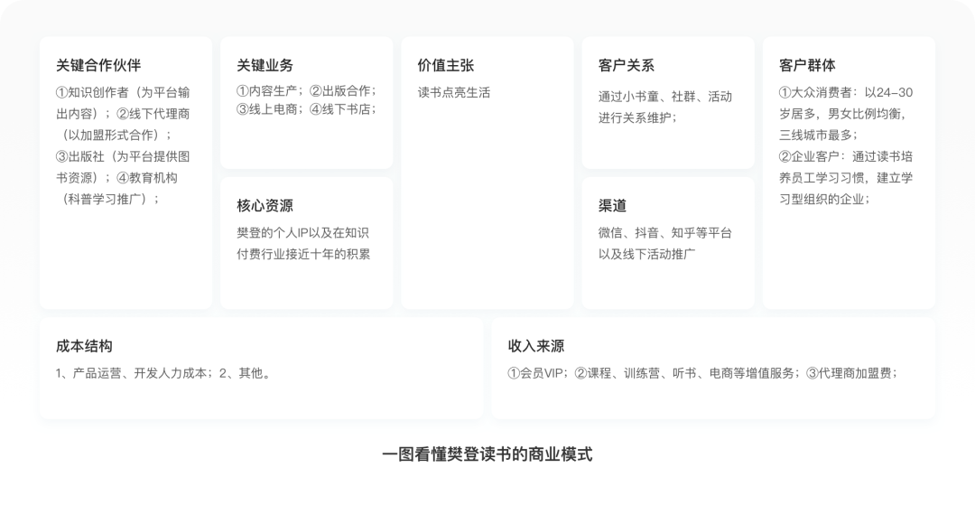 「读书服务」是樊登读书最核心的服务,是实现商业变现最重要的方式。从讲书人去拆分,樊登读书设计了樊登讲书(火车头)、李蕾讲经典(前央视主持人,自带流量和曝光度)和非凡精读(汇聚各行业精英大咖)三个版块。从知识学习的场景拆分,樊登读书设计了「课程」和「书城」两大版块,如今的樊登读书,已经成为一个非常丰富的知识付费学习平台,不仅有各种知识付费、职业培训课程,还有训练营、系统课,以及有声书和实体书销售等业务,内容非常夯实。从用户群体去拆分,樊登读书还设计了企业共读营、线下翻转课堂和数字阅读空间这些面向企业的读书服务,把读书赋能给企业,为他们提供提供综合性的读书解决方案,以建立学习型组织为目标。