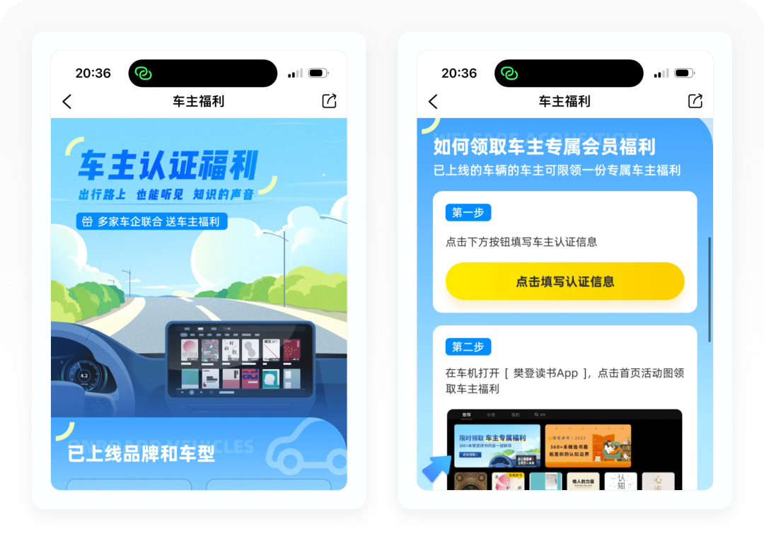 「车主福利」也是一个樊登读书和其他行业完美链接的活动形式,樊登读书通过和一些汽车品牌进行深度合作,直接以车载应用的形式载入到汽车设备,用户在驾车的时候可以直接收听樊登读书的内容,多场景提升用户黏度,让用户随时随地都能收听。