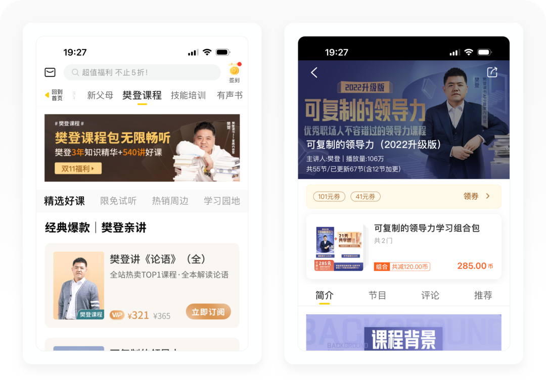 樊登不仅讲书,还设计了很多的课程,比如樊登讲《论语》、可复制的领导力这些以代表作设计出来的课程。樊登课程的栏目首页包含了精选好课、限免试听、热销周边和学习园地四个内容。