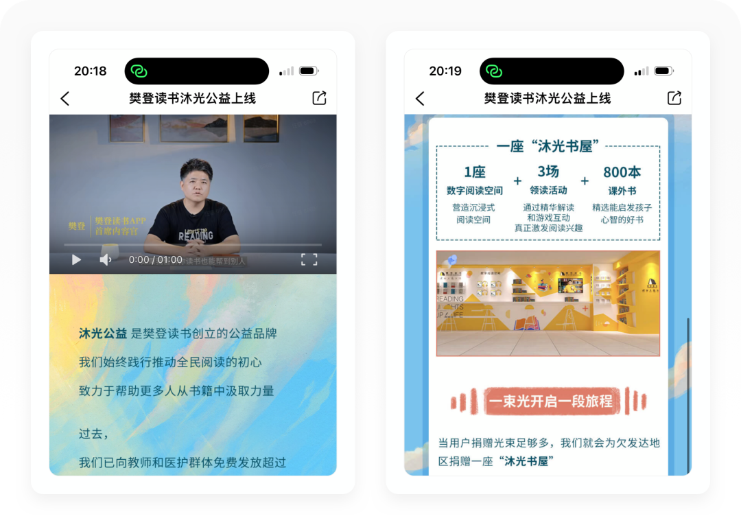 沐光公益是樊登读书创立的公益品牌,主要为落后的偏远山区孩子们建立爱心图书室,帮助孩子们建立阅读习惯。他的捐赠规则是当用户捐赠的光束足够多,樊登读书就会为欠发达地区捐赠一座“沐光书屋”。用户可以通过两种方式为山区的孩子们进行捐赠,第一种是在樊登读书APP每听完一本书就会产生一束光;第二种就是通过在樊登读书的直播间购买书籍,捐献一束光。这样的活动设计,结合了公益,更容易打动用户,重新让用户更愿意多读书,提升用户活跃度。