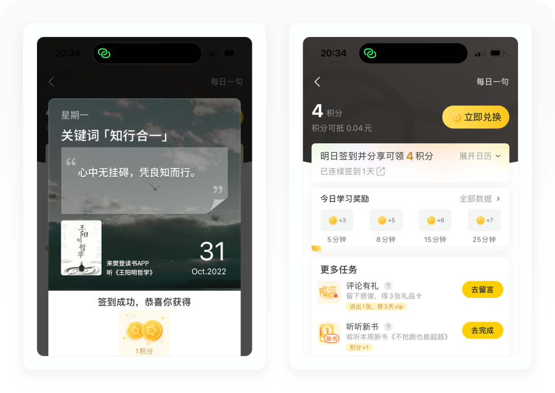 用户可以通过每日签到领取积分,以7天为一个周期,连续签到积分加倍,积分可以在商品购买时候进行抵扣。在任务中心,樊登读书设计了不同的小任务,以极低的行动成本鼓励用户进行分享、读书和评论从而赢取积分。
