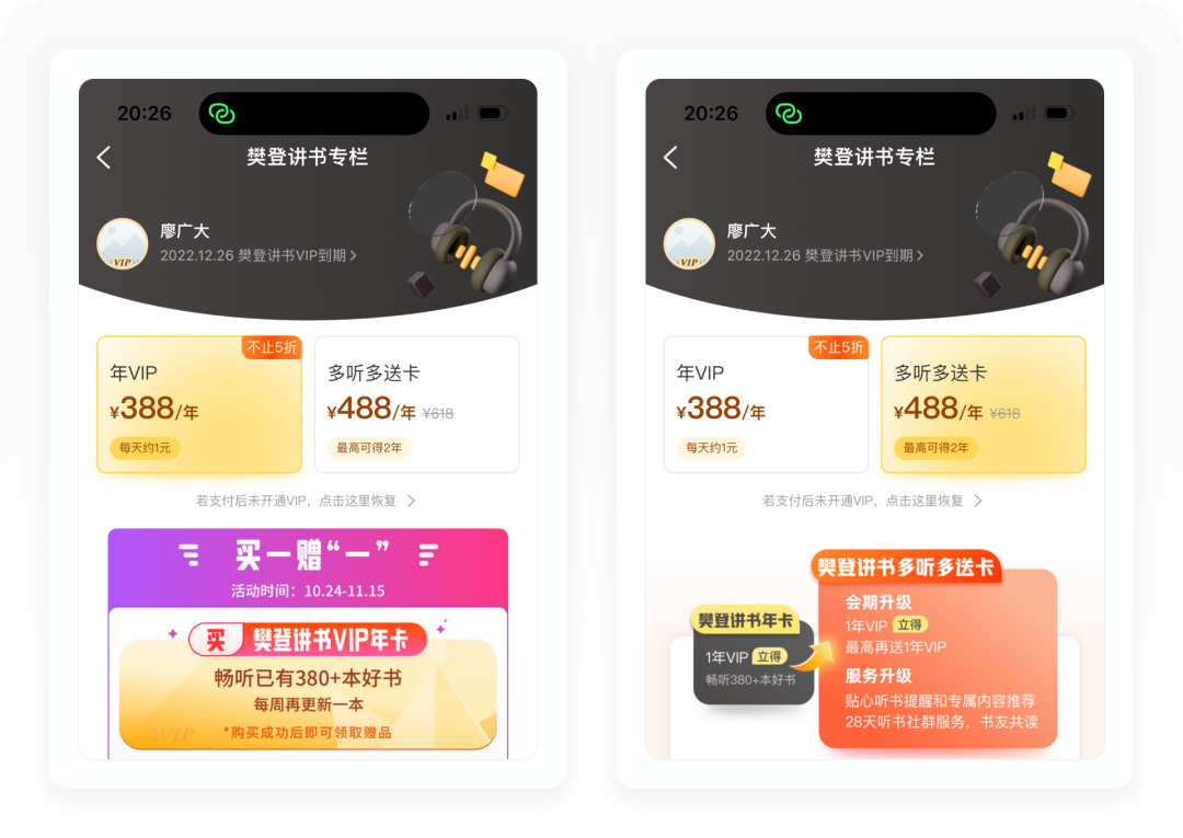 其次樊登读书还设计了一个多听多送卡的会员升级服务,售价488元,鼓励已付费的会员进行会员升级。升级以后可赠送下一年的樊登讲书年卡,每周听1本书可赠送7天VIP时间,不限时间积累,赠满1年即可获得下一年VIP。