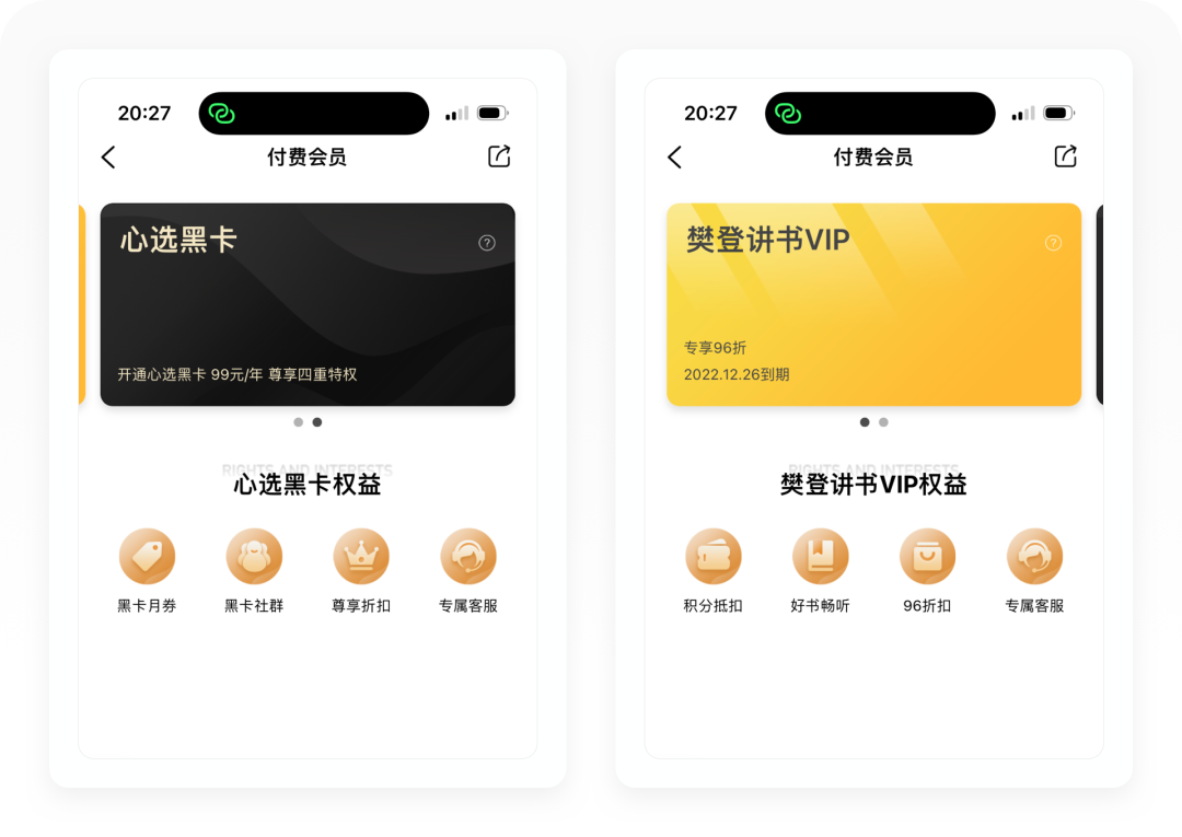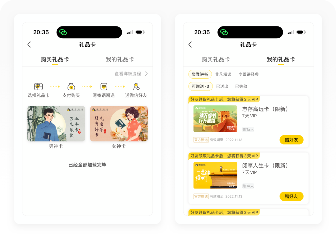 「礼品卡」是一种线上的虚拟VIP卡,用户可以购买赠送给好友,售价388元,其实就是樊登讲书的VIP。樊登读书把礼品卡设计成了一种裂变形式,官方会给用户赠送限时的礼品卡(一般为7天),好友领取以后,用户还可以获得3天的VIP时长,传播拉新能力非常强。