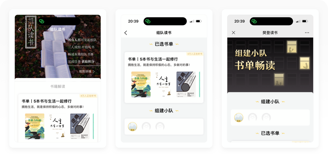 「组队读书」的活动规则很简单,所有人都可以发起组队,三人成组开始听书,完成任务以后可以获取积分。这个活动对用户的拉新和提升活跃度有很大帮助,老用户为了获取更多的积分,邀请到越多的新用户,组队奖励就会翻倍。