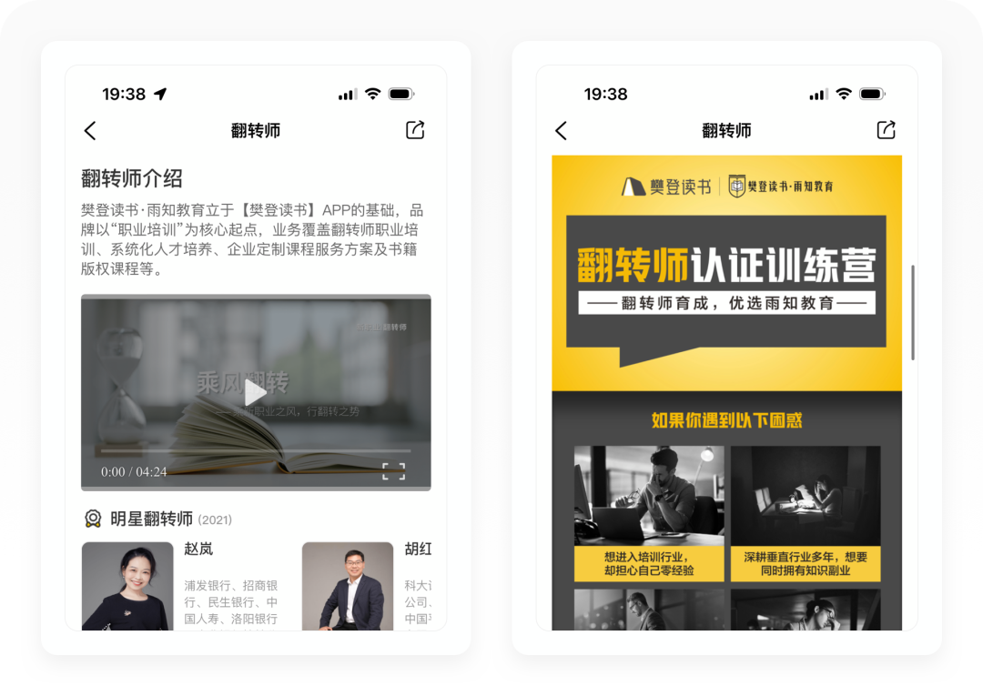 翻转师是樊登读书·雨知教育的核心服务,课程体系分为六大板块,目标人群是自由讲师、教师、企业培训者等,最终帮助他们成为樊登读书的授课讲师、知识主播和知识顾问。翻转师是付费的系统培训,定价5686元。