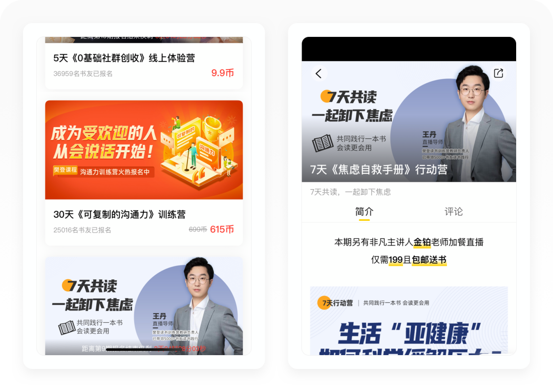 「小课程」是指培训时间在3-7天左右的训练营,比如7天《焦虑自救手册》行动营(199元)、3天《分享阅读》线上启动营(9.9元)。这类小课程是樊登读书训练营的核心内容,属于短频快的业务,商业变现能力极强。