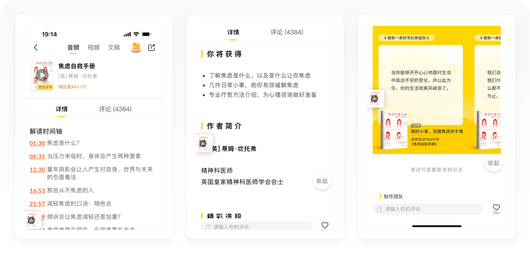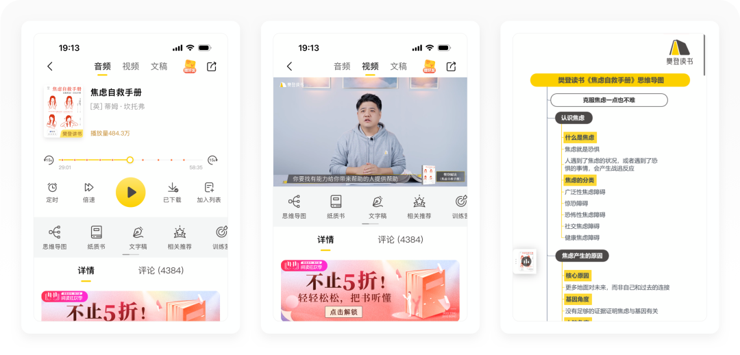 ①「讲书」有三种传播形式,默认为音频,其次还有视频和文稿,非常丰富,用户可以在头部自由切换。每一本书就像一个产品、一个主题,除了收听讲书内容,还支持下载音频和思维导图,其次还加入了增值服务,比如实体书购买和训练营(根据这本书的主题设计)。
