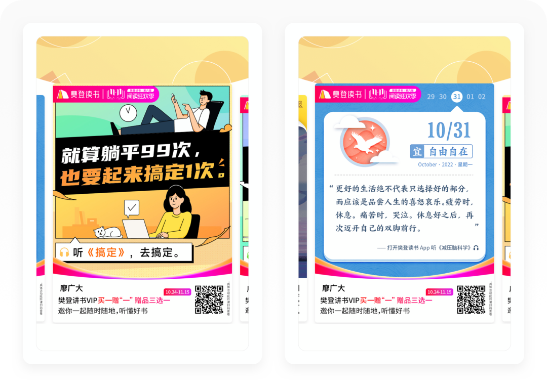 「邀请好友」的设计特别简单,但是海报的文案非常打动人,通过很多名言警句和热门书籍生成的海报,直接转发给好友或发布在朋友圈,有新用户注册付费以后,老用户则可以领取听书时长。
