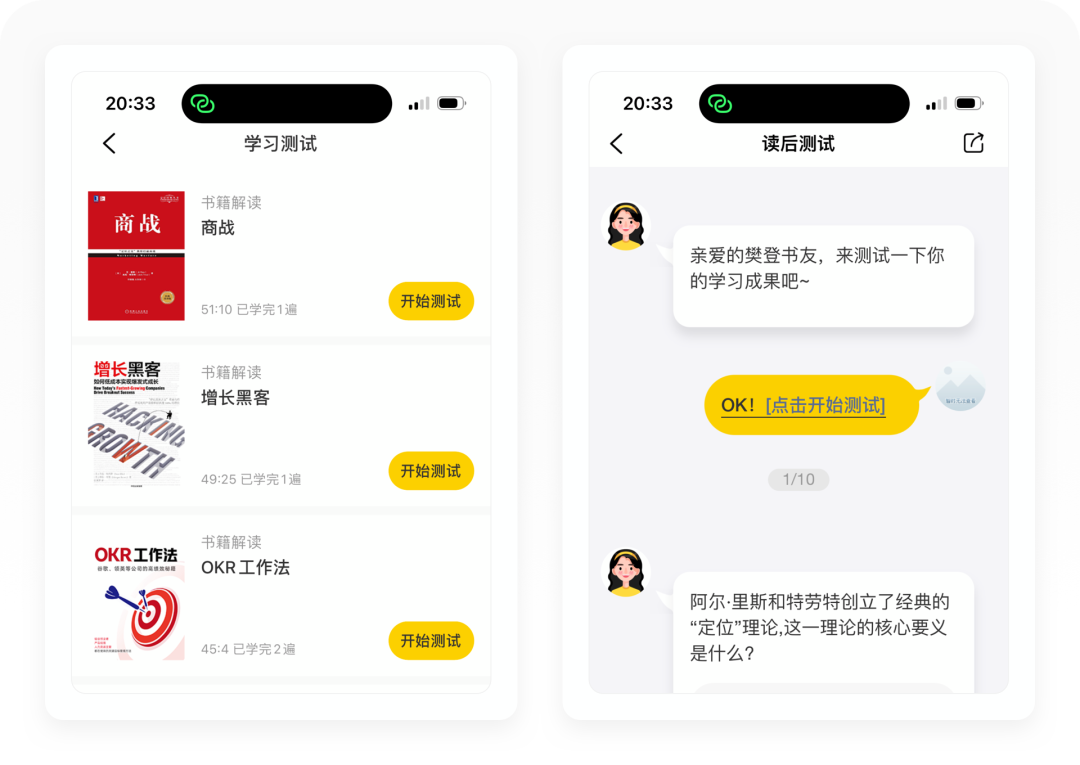 当用户听完一本书,为了帮助用户更好的理解这本书的知识,樊登读书设计了一个测试答题的环节。用户答完题以后,不仅可以查看答案解析,还可以生成朋友圈海报分享,传播拉新。