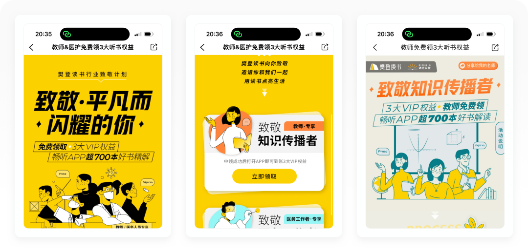 「领听书卡」这个用户权益主要是回馈教师和医护这两个行业的用户群体。樊登读书设计得特别巧妙,如果你是这两类用户,你可以填入个人信息进行申请;如果你不是,你可以分享给你的老师或朋友(职业为教师和医护),这样的设计简直让用户很难有抵抗力,让用户主动为产品拉新。而且听书卡只有1个月的福利,免费试听结束后极大可能转化为付费会员。