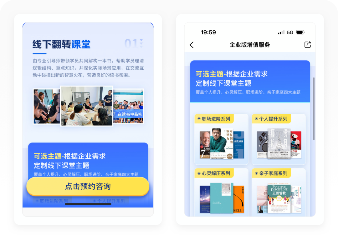 「企业共读营」是通过优质书单和共读工具,让员工在21天社群的督促和专家指导下,一起共读,通过听、学、教、练和评五个步骤帮助员工学习读书,打造全流程的闭环训练场景,旨在帮助员工养成读书的习惯,为组织营造读书氛围。