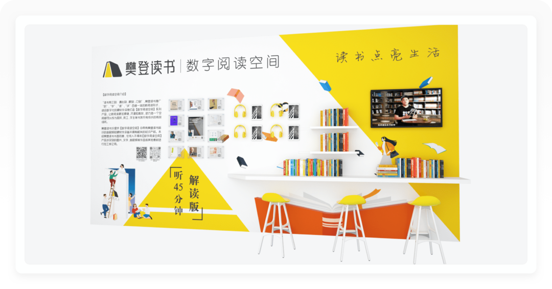 「数字阅读空间」就是在企业办公场地可利用的空间里面,通过硬件设备作为载体,将图片、文字、音视频等内容置入,让员工扫码就可以收听,同时通过这样的设计,为企业打造阅读的氛围。