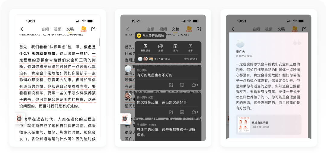 ③「文稿」的设计体验特别好,和其他音频产品相比,樊登读书的文稿像是参考了微信读书这样的阅读产品。用户可以划线,可以发表想法,划线最终会生成笔记储存在用户中心,还可以把划线的内容生成海报分享,为平台拉新引流。