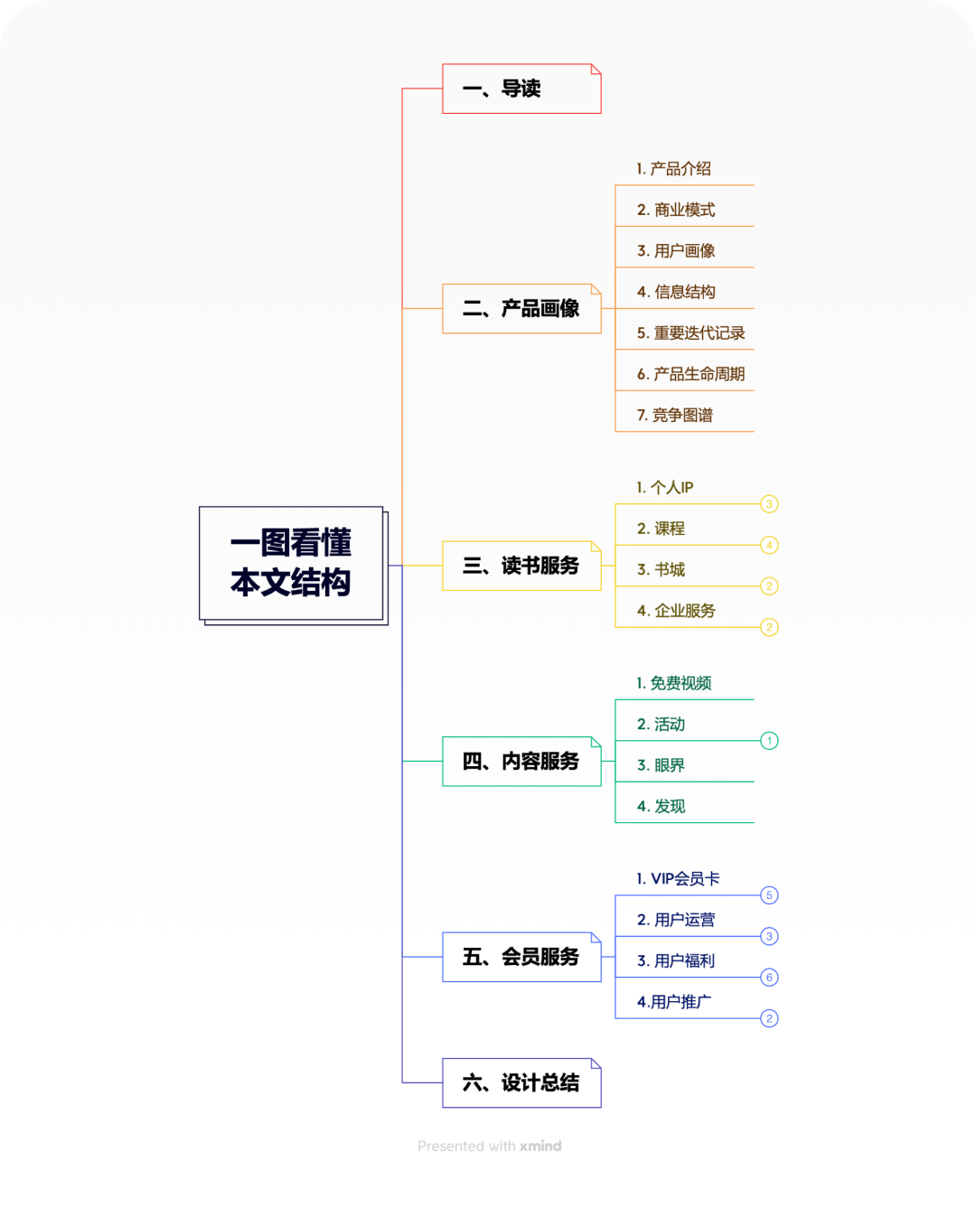 全文11158字,分为六个部分,分别是导读、产品画像、读书服务、内容服务、会员服务和设计总结,你可以通过下面的思维导图对本文内容结构有全面的了解。