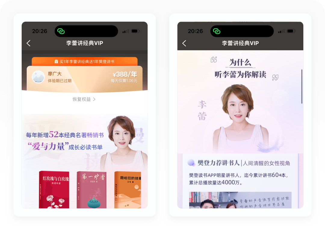 李蕾是前央视主持人,2021年加入樊登读书。围绕「李蕾」这个个人IP,樊登读书设计了「李蕾讲经典」栏目,每年为用户解读52部经典名著,包含世界名著、国风经典、名人传记和中国现代经典。在商业变现的设计形式方面,樊登读书把「李蕾讲经典」作为一个独立的栏目,用户需要单独购买VIP会员才能收听。