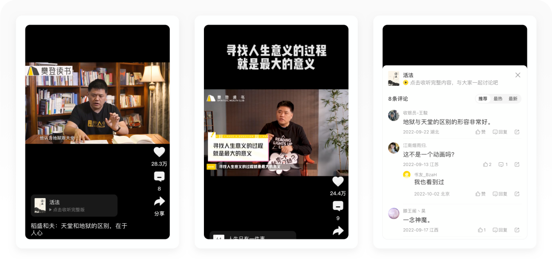 「免费视频」是一个短视频栏目,内容主要从樊登讲书的视频提炼出精华片段剪辑成1-2分钟的短视频。这个栏目设计得非常好,第一,把一个长达45分钟的读书视频拆分出来以后,不仅可以降低阅读成本,还增加了碎片化阅读的形式,降低用户读书的时间成本,可以极大提升用户的读书时间;第二,一个免费视频对新用户来说,就是一次免费试听,通过对精华内容的提炼,对用户的激活有非常大的帮助;第三,免费视频同时可以作为高质的短视频素材,分发到抖音、视频号、小红书和知乎等平台,帮助平台传播引流。