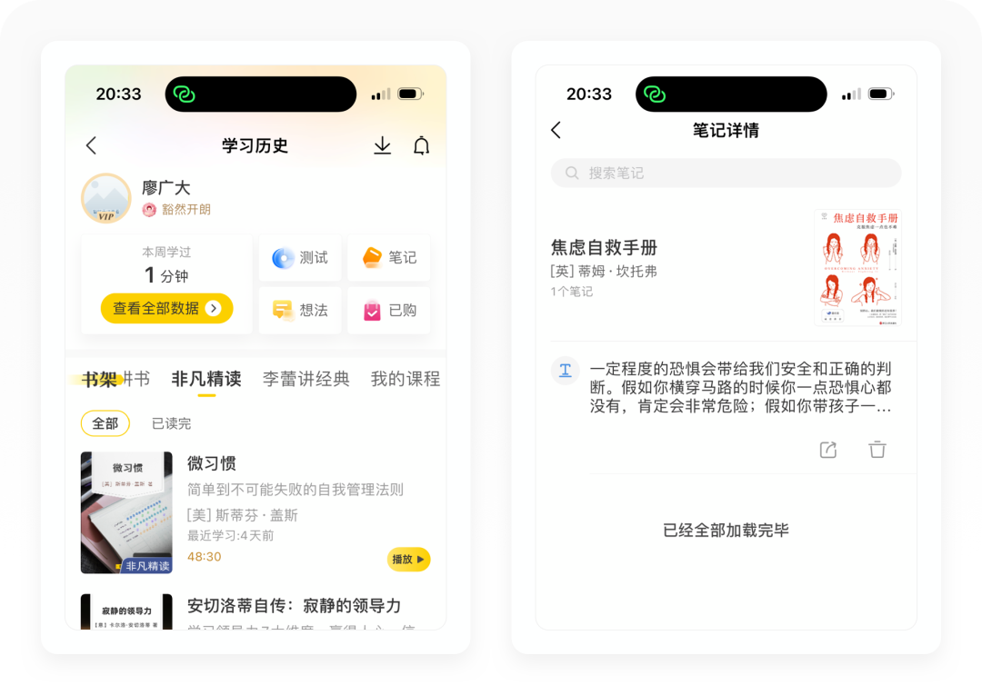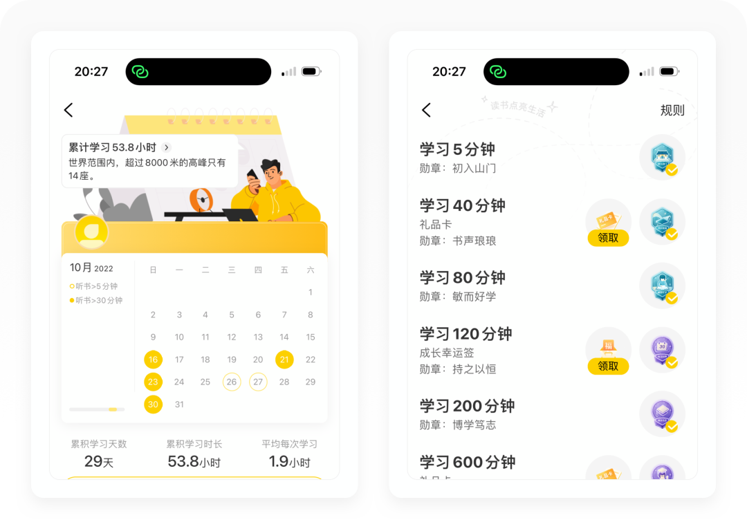 「学习数据」的统计维度非常细,为用户生成今日、本周以及历史学习时长记录,根据用户的阅读习惯生成「听书偏好指数」。其次还设计了一个影响指数,也就是如果用户分享给好友以后,「学习数据」也会统计好友的读书时长,生成用户的影响听书时长,设计得特别有创意。