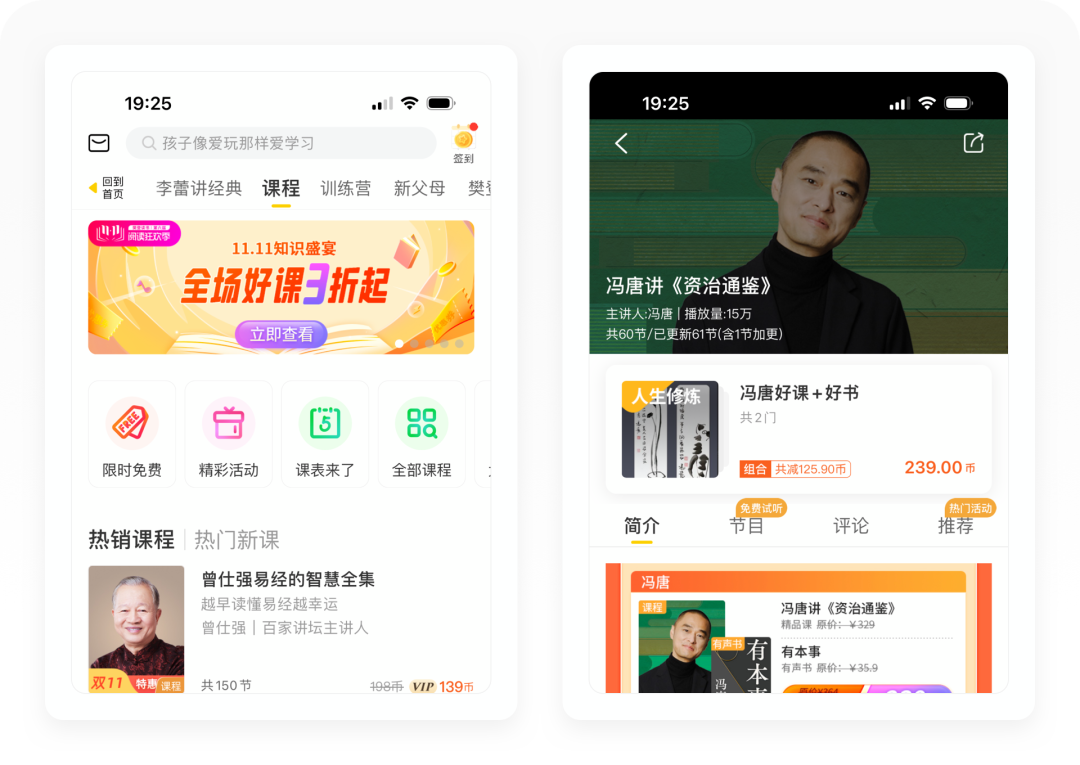 课程栏目首页的设计,主要包含金刚区、热销课程、课程合集、限免节目、最近在学和专属为你推荐六个内容。在销售方式上,课程是以单个付费的形式销售,定价在100-300元之间。