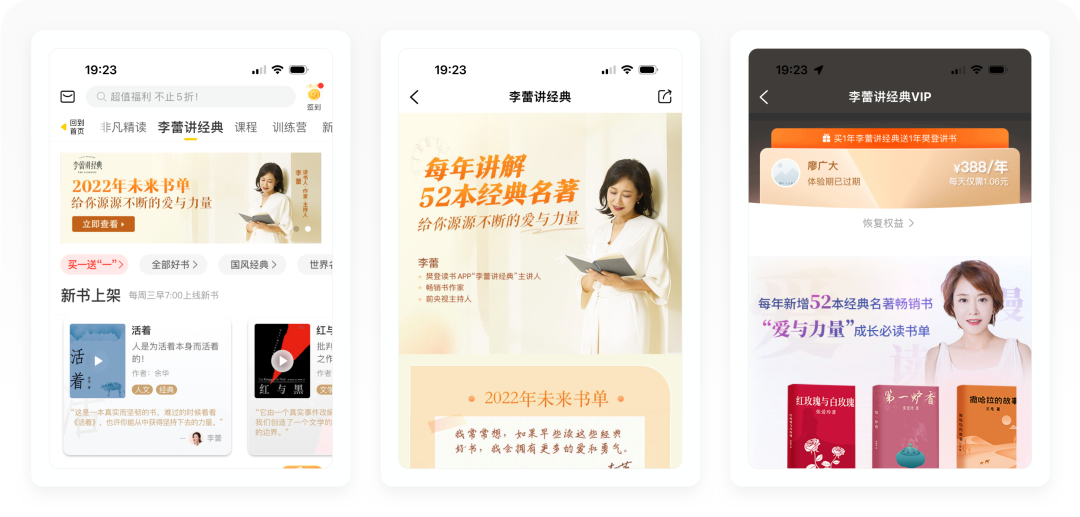 樊登读书以「樊登」这个超级IP作为火车头,每年讲解52本书为底层服务内容,现在加入了「非凡精读」和「李蕾讲经典」两个内容栏目。这两个栏目,不仅可以丰富平台的内容,还可以弥补樊登一年只讲52本书的数量缺陷,从而满足更多用户的需求。