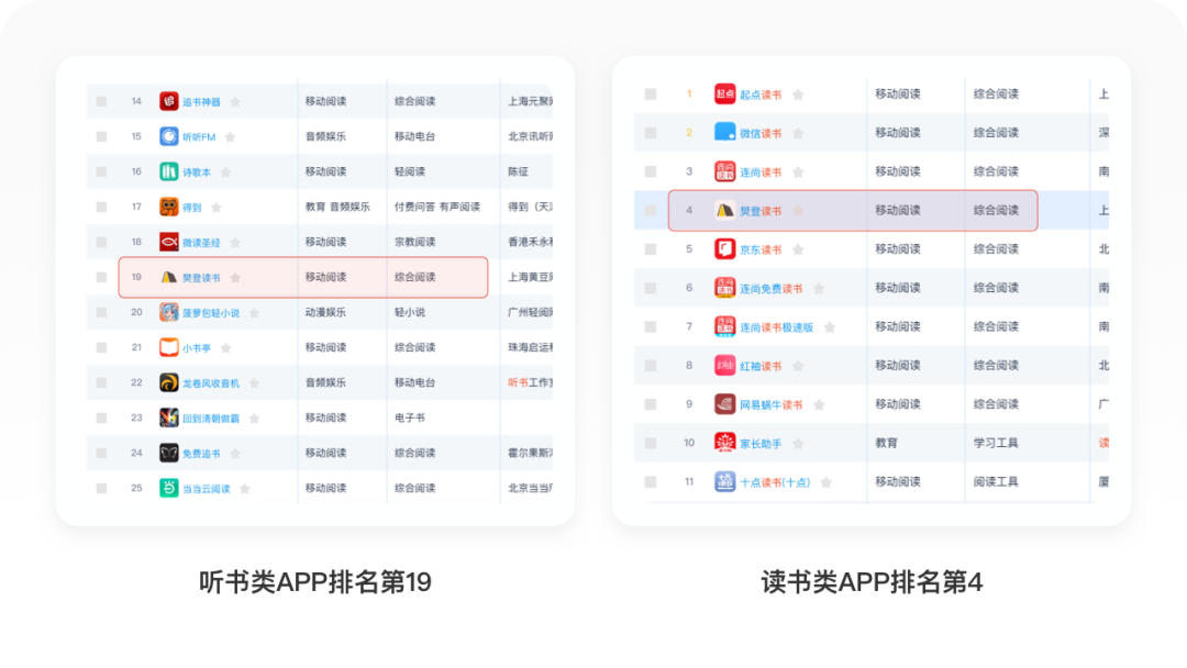 和听书类APP相比,樊登读书月活跃用户人数排名第19,喜马拉雅1.3亿月活跃用户人数全网第一;和读书类APP相比,樊登读书排名第四,起点读书月活跃用户人数1762.70万全网第一。