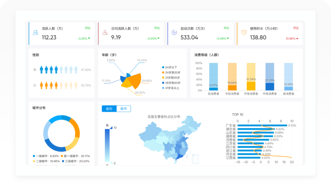樊登读书的用户群体男女比例均衡,女性占比54.67%,男性占比45.33%;年龄以24-30岁居多,占比40.21%,其次为31-35岁,占比26.36%;樊登读书的用户消费能力较强,中等以上消费者占比71.09%;用户以三线城市最多占比23.20%,一线城市仅占8.93%,其中广东省最多,山东和河南省位居前三。
